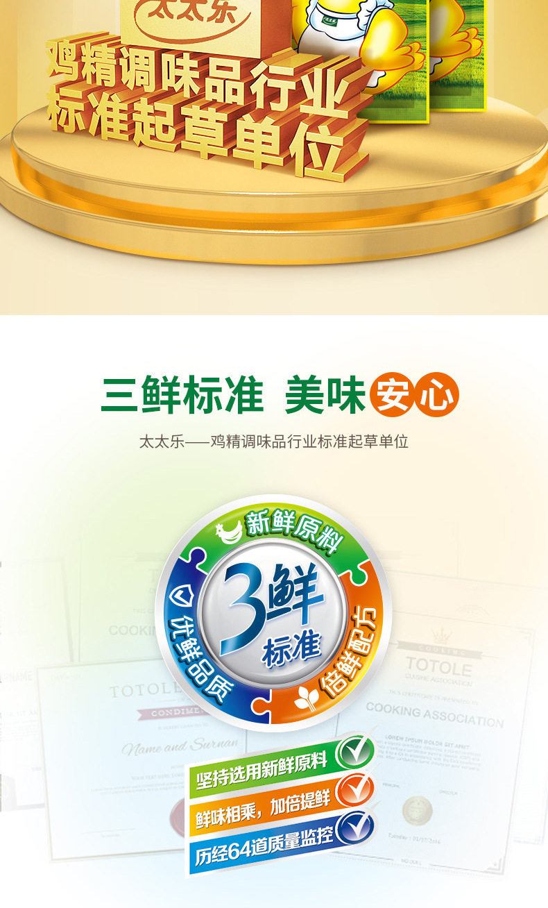 | Packaging specifications | Three fresh chicken essence 100g,Three fresh chicken essence 180g,Three fresh chicken essence 40g,Three fresh chicken essence 88g,Totole fresh vegetables 180g,Sanxian chicken essence (filling) 227g,Three fresh chicken essence 454g,Totole chicken powder 270g,Totole fresh chicken juice (all-purpose freshness enhancer) 408g,Xianweibao seasoning 500g,Msg 100g,Msg 250g,Three fresh chicken essence 200g |