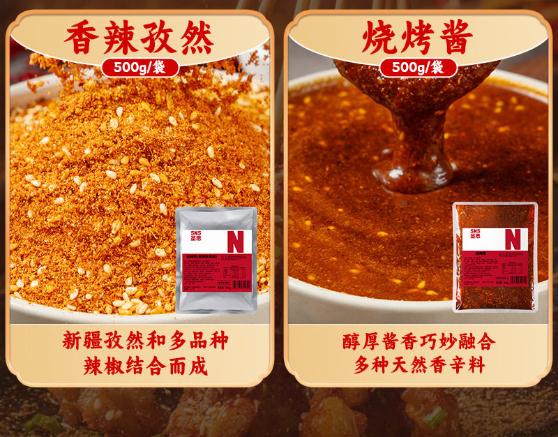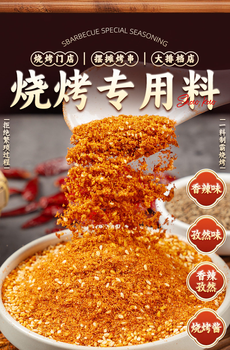 | Packaging specifications | Bbq ingredients 500g/spicy flavor,Bbq ingredients 500g/cumin flavor,Bbq ingredients 500g/spicy cumin flavor,Barbecue sauce 500g,Bbq ingredients 500g*10/spicy flavor,Bbq ingredients 500g*10/cumin flavor,Bbq ingredients 500g*10/spicy cumin flavor,Barbecue sauce 500g*10 |