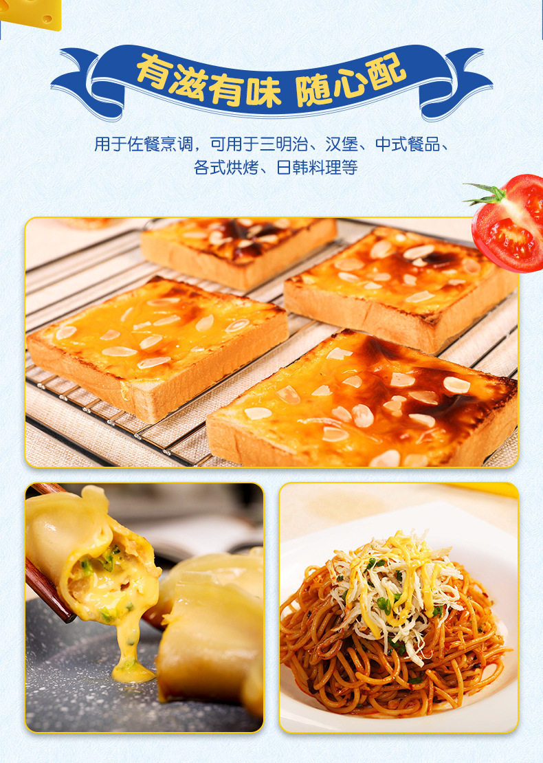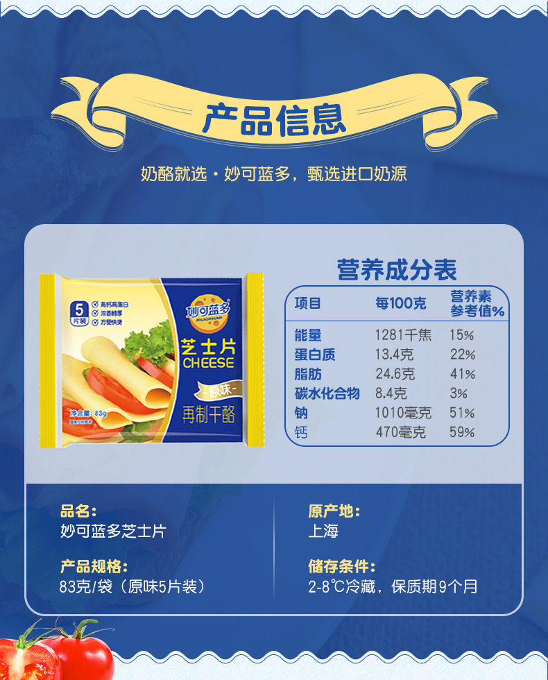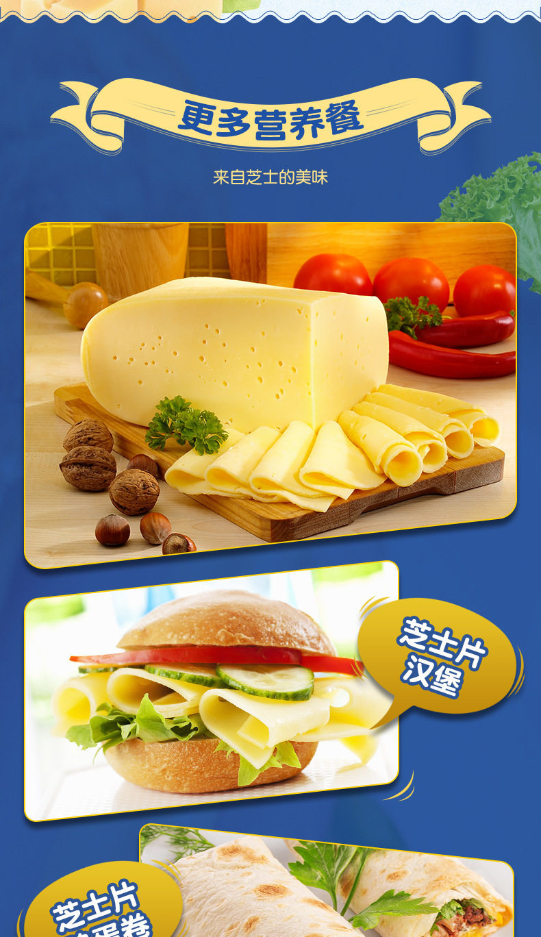 | Packaging specifications | Cheese slices 83g 5 slices,Shredded cheese 125g,Shredded cheese 450g,Shredded cheese 350g light fat version |