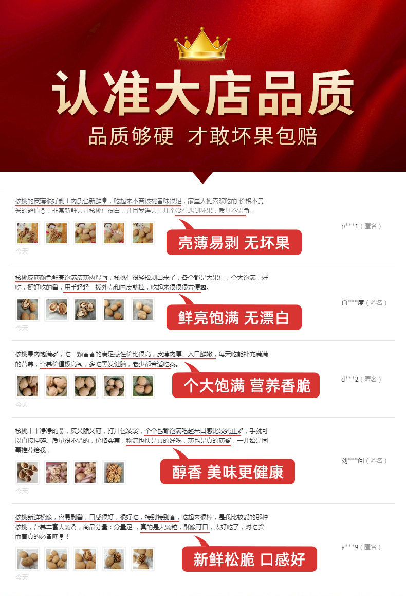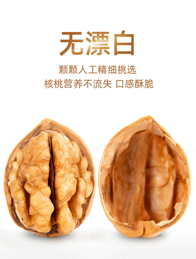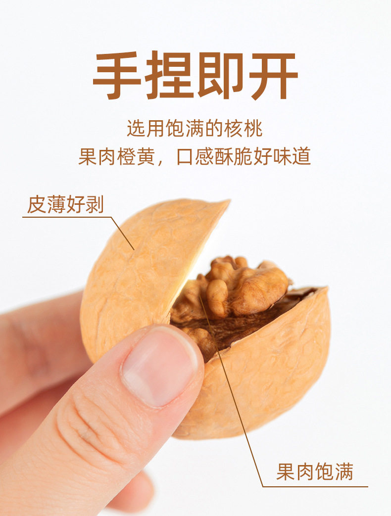 | Packaging specifications | Selected large fruits, hand-peeled paper-skinned walnuts 500g*1 bag [selected new products, open with hand pinching],Selected large fruits, hand-peeled paper-skinned walnuts, 500g*5 bags [new genuine paper-skinned products, highly recommended by the store manager],Selected large fruits, hand-peeled paper-skinned walnuts 500g*2 bags [look for the quality of the big store, bad fruits will be compensated],Selected large fruits, hand-peeled paper-skinned walnuts 250g*1 bag [selected new products, open with hand pinching] |