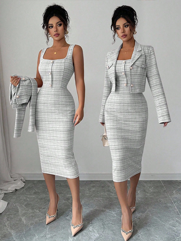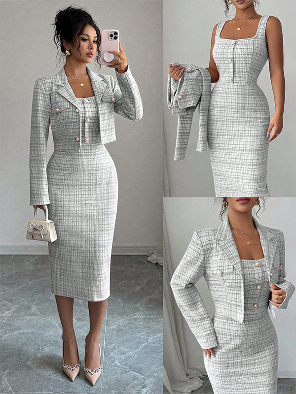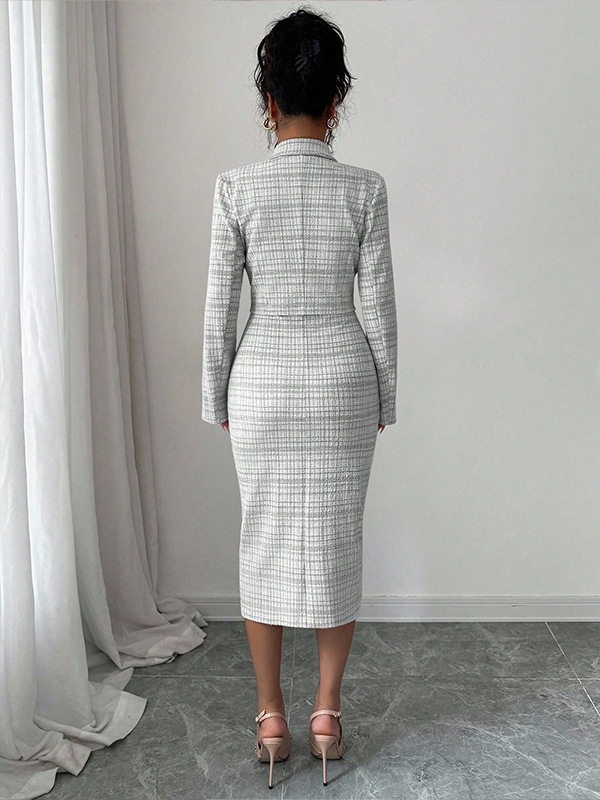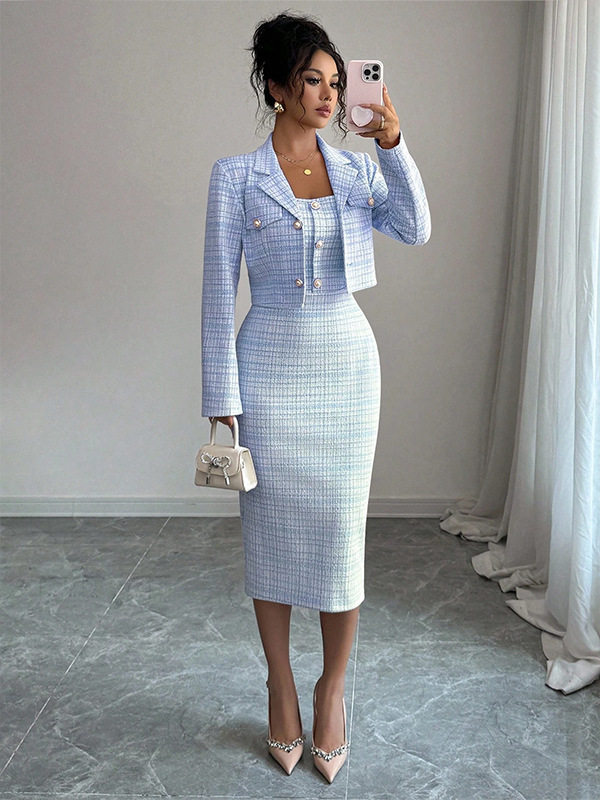 2025 Cross-Border European and American Two-Piece Skirt Suit with Lapel, Long-Sleeved Short Plaid Jacket, Chanel-Style Blazer Suit