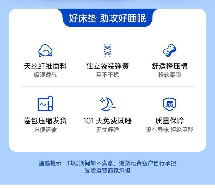 | Color | Type a nine-zone pocketed spring is soft and fits well and is shipped in rolls,Type b independent spring + 3e brown hard spine protector shipped as a whole,Type c nine-zone pocket spring + 1 point latex shipped in rolls,Model d zero-pressure, comfortable and efficient support, shipped in rolls,E type nine-zone pocket spring + 2 points of latex shipped in rolls,Model f is an exclusive dual-use type with 70% selection and shipped in one piece |