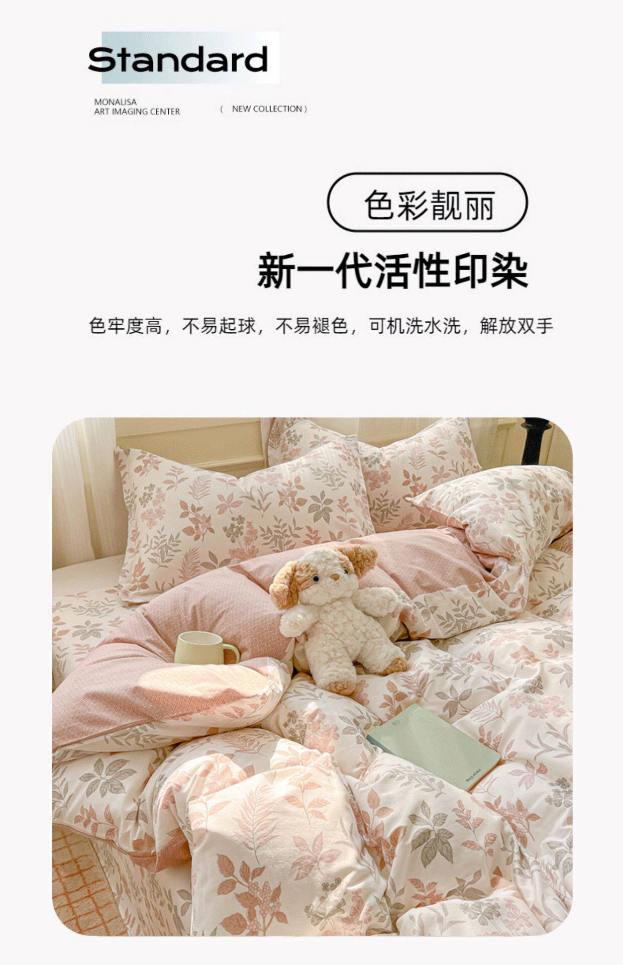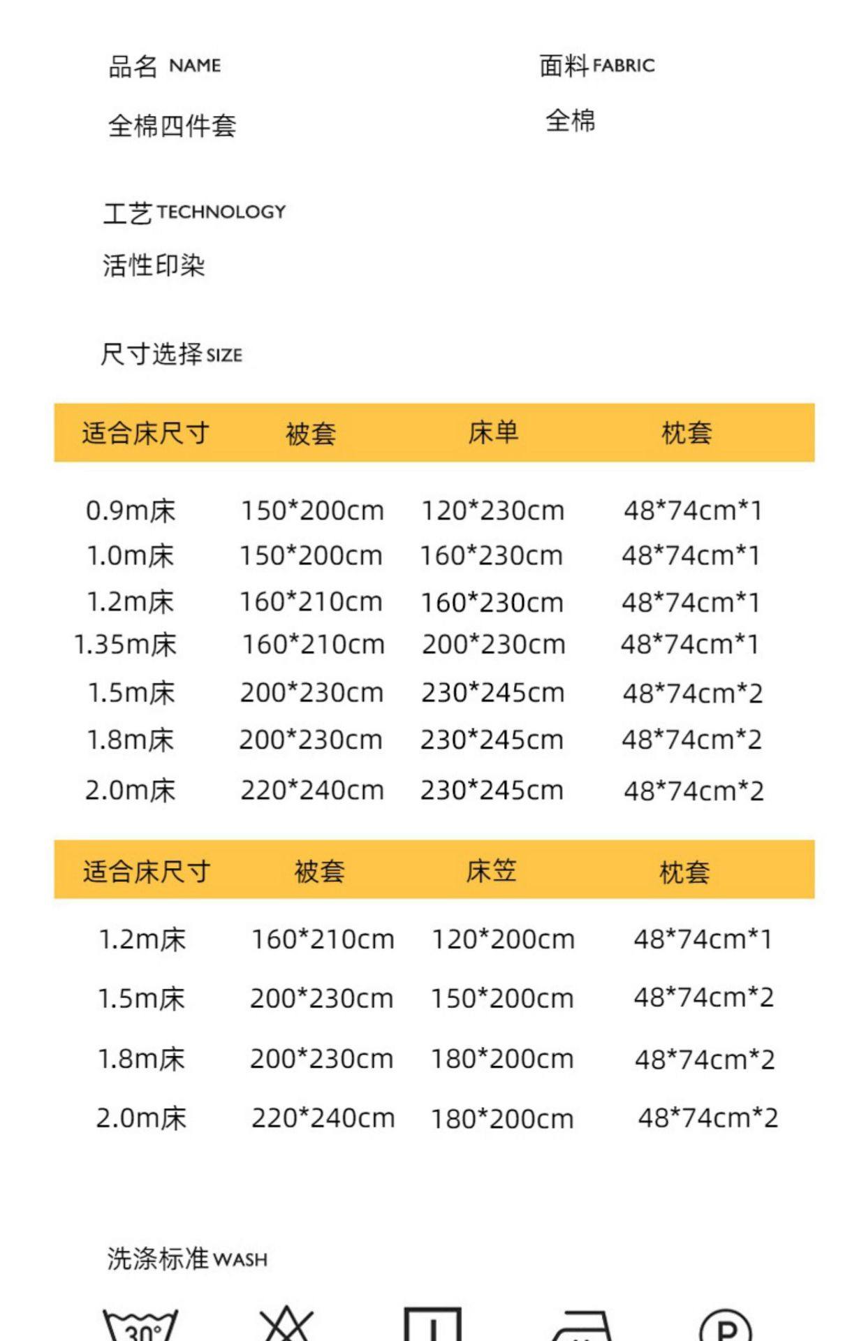 | Size specifications | 0.9m bed [three-piece dormitory bed set] suitable for 150x200cm quilt core,1.2m bed [three-piece bed sheet set] suitable for 150x200cm quilt core,1.5m bed [sheet set of four] suitable for 200x230cm quilt core,1.8m bed [sheet set of four] suitable for 200x230cm quilt core,2.0m bed [sheet set of four] suitable for 220x240cm quilt core,1.5m bed [four-piece fitted sheet set] suitable for 200x230cm quilt core,1.8m bed [four-piece fitted sheet set] suitable for 200x230cm quilt core,1.8m bed [four-piece set of fitted sheets] - suitable for 220x240cm quilt core |