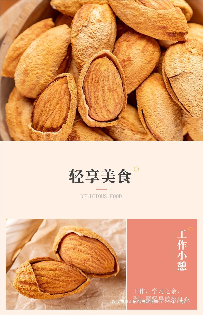 | Packaging specifications | Grab: impulse] 2 cans of almonds, totaling 500g (will be removed from the shelves after grabbing),[selected almonds] half a catty in a bag: 250g*1 bag,[thin-skinned and easy to peel] 250g*1 bag (net weight half a catty),[selected almonds] bag 0.5kg : 250g*2 bags,[thin-skinned and easy to peel] 250g*2 bags (net weight 0.5kg ),[selected almonds] bag 1.0kg : 250g*4 bags,[thin-skinned and easy to peel] 250g*4 bags (net weight 1.0kg ),Exquisite cans] 2 cans totaling 500g (including cans) net weight 300g,Exquisite cans] 4 cans totaling 1000g (cans included) net weight 600g,50g almond wood (small bag) |