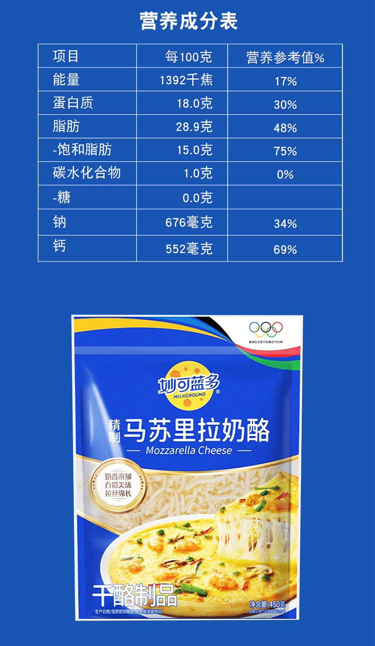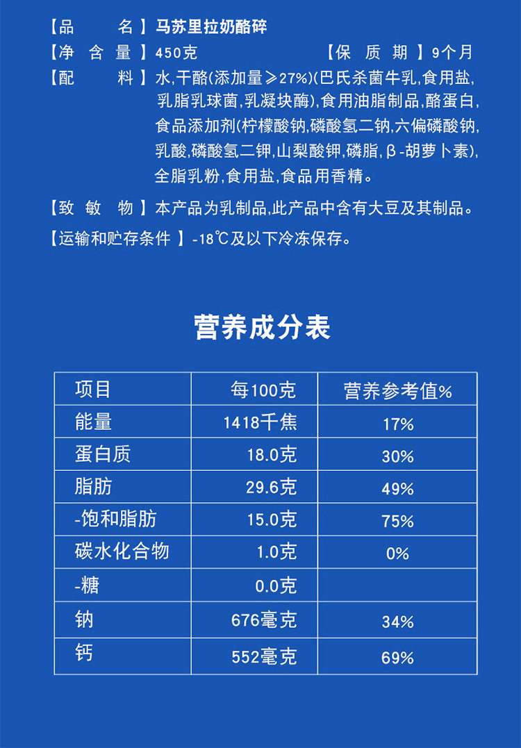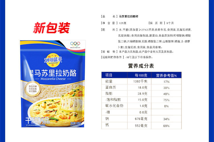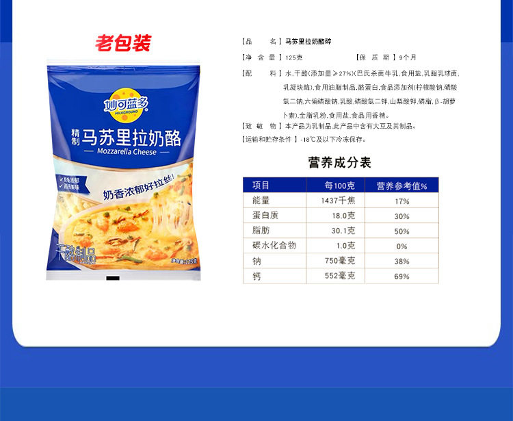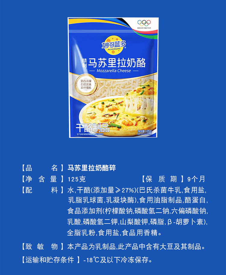 | Packaging specifications | 1680875922087501862 shredded mozzarella cheese (125g)*10 bags |
