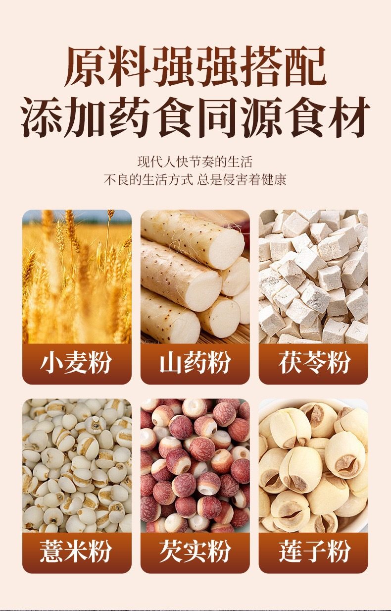 | Raw materials and ingredients | Wheat flour, yam powder, poria powder, barley flour, gorgon powder, lotus seed powder, edible salt, water |