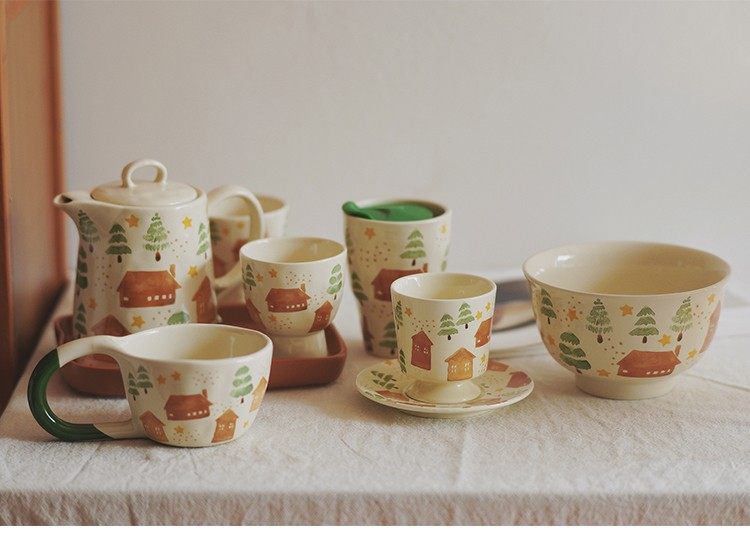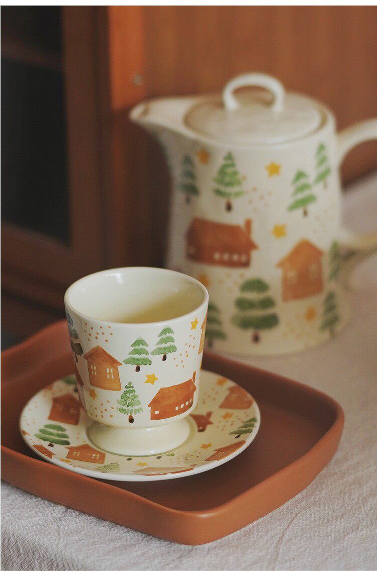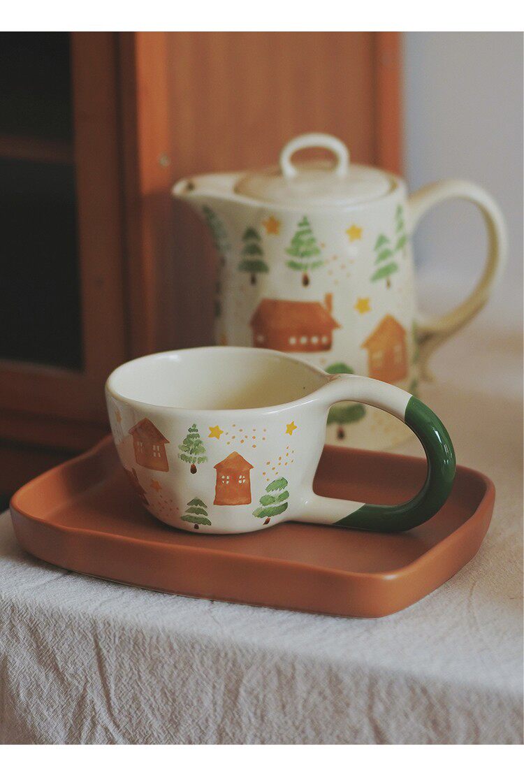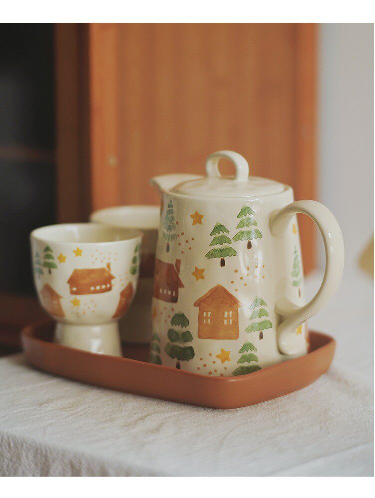 House and Tree Hand-Painted Ceramic Tableware Kettle Coffee Cup Set