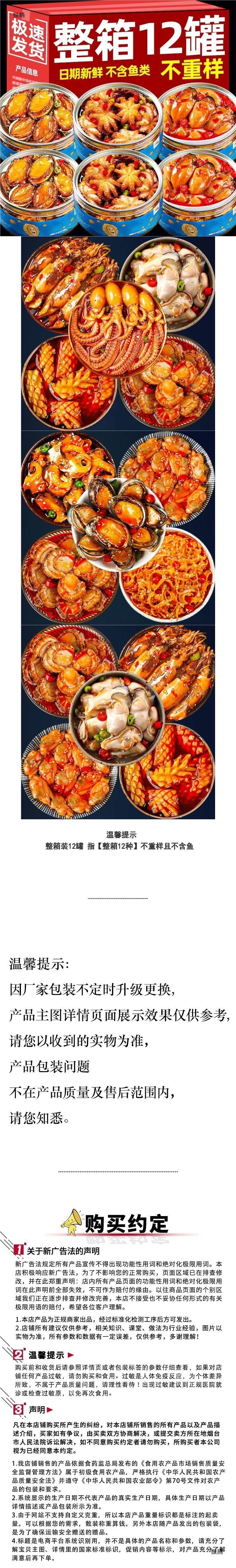 | Packaging specifications | 1 can of spicy sea rabbit [taste],**[full box of 12 types] no duplicates and no fish included,Eight tentacles + oysters + sea rabbit + squid + scallops (5 cans),Oysters + sea rabbit + scallops + clams + squid (5 cans),Abalone + conch + clams + scallops + skirt (5 cans),Spanish mackerel + oysters + scallops + clams + squid (5 cans),Scallops + sea rabbit + clams (3 cans),Oysters + sea rabbit + scallops (3 cans),Eight tentacles + scallops + clams (3 cans),Sea rabbit*2 cans,Clam meat*2 cans |