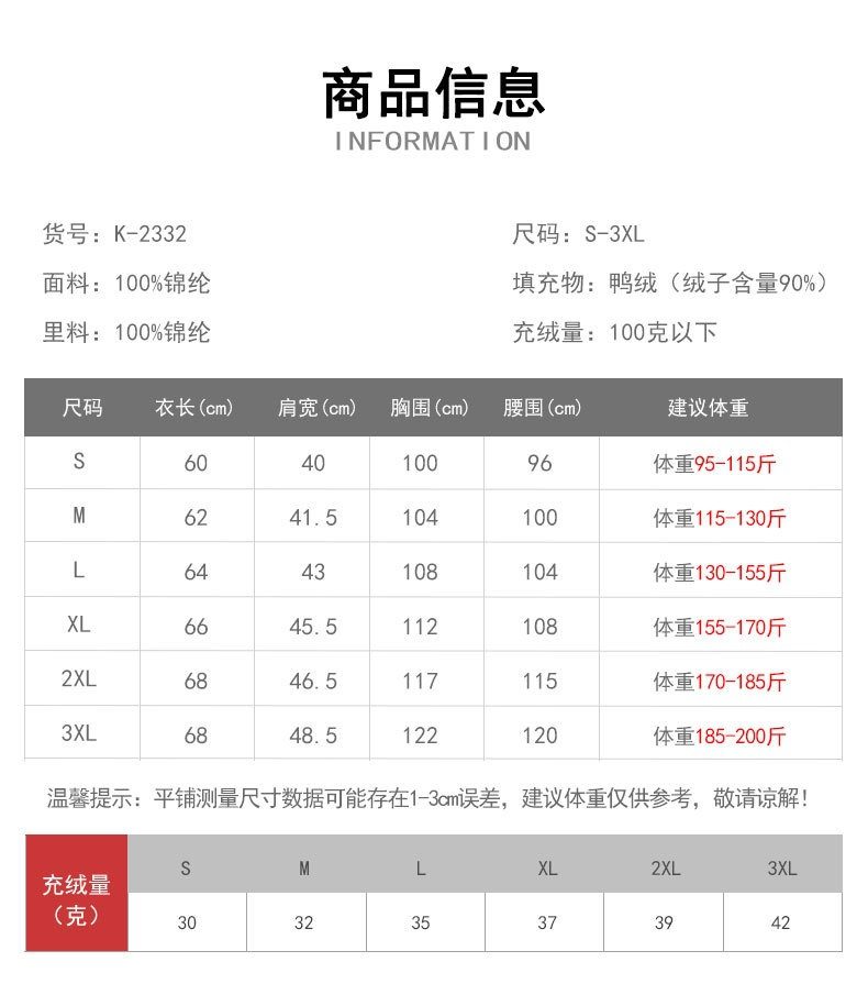 Down filling amount Below 100g (not included)