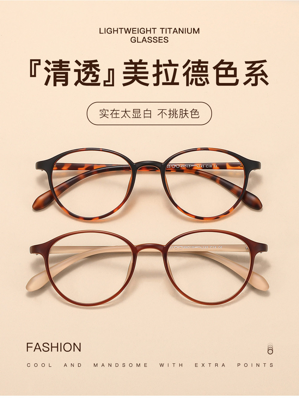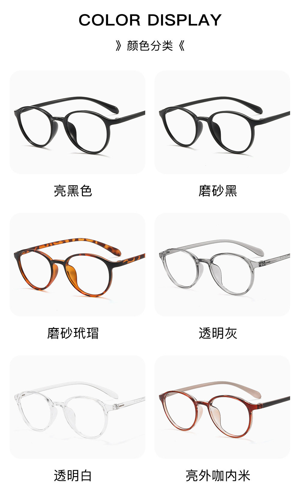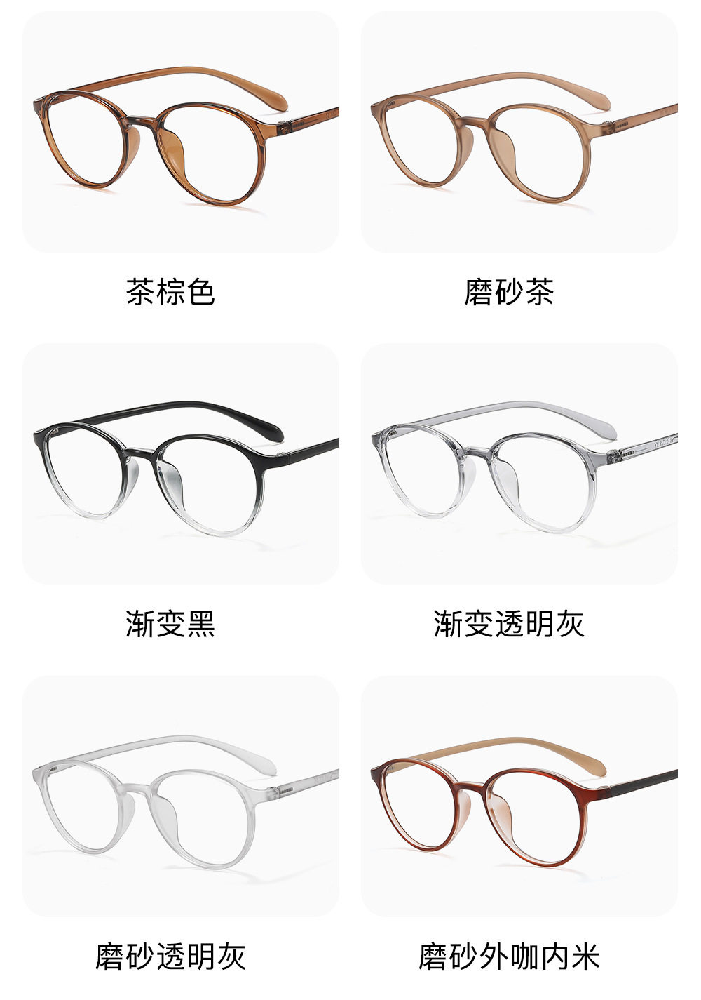 | Frame color | Glossy black,Matte black,Transparent gray,Frosted tortoise shell,Bright tortoise shell,Frosted transparent gray,Gradient transparent gray,Frosted tea,Milk coffee color,Bright outside and inside rice,Frosted outer coffee and inner rice,Tea brown,Champagne tea,Gradient black,Transparent white,Olive green |