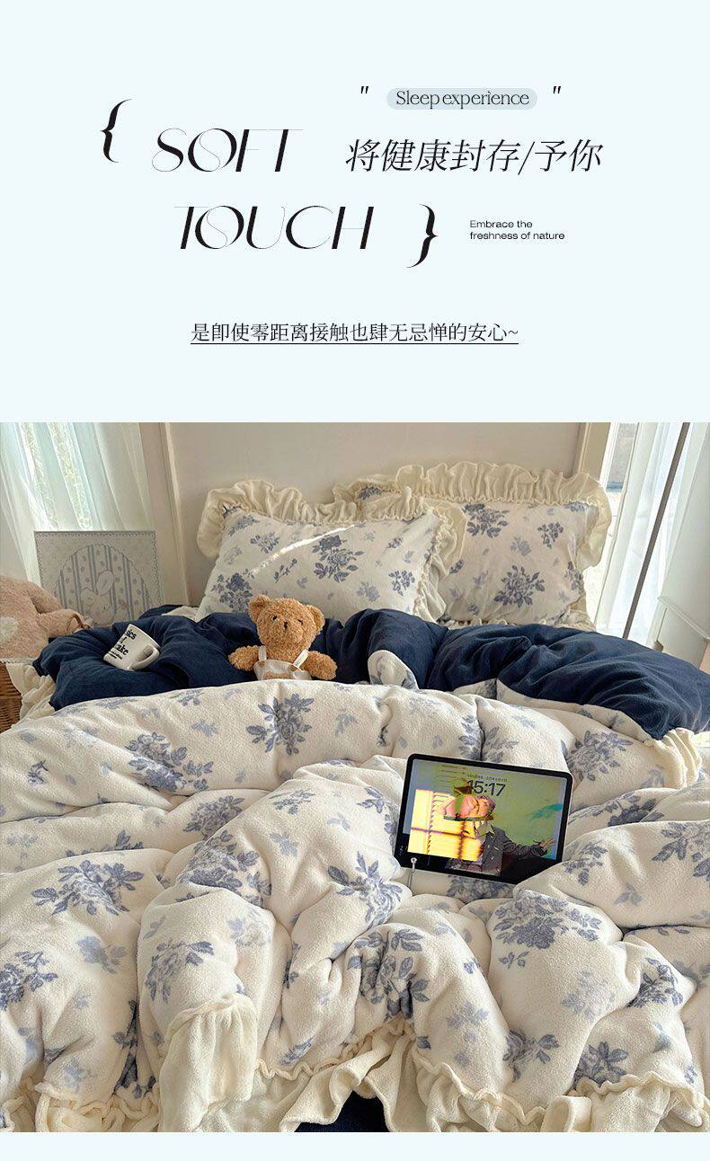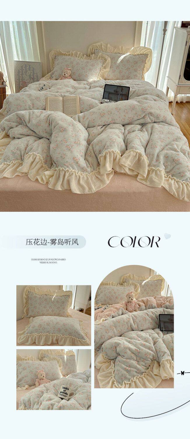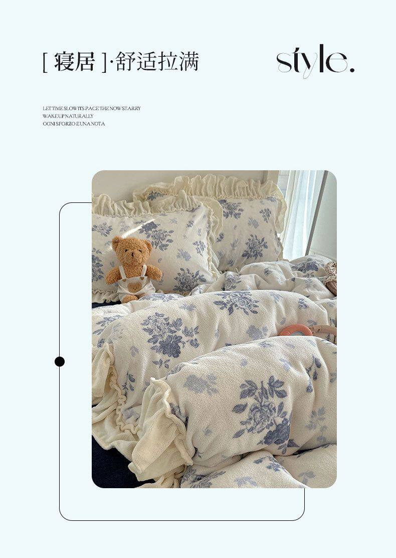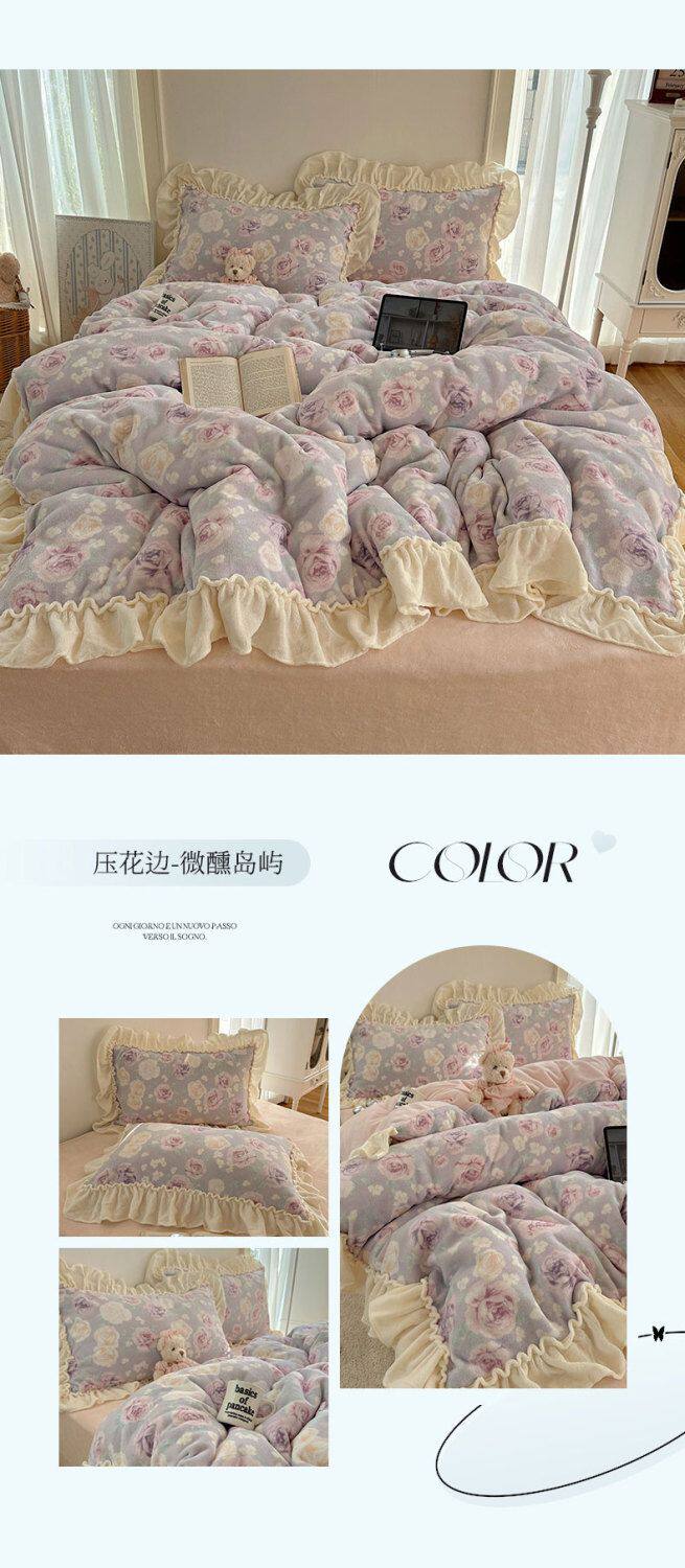 Korean Floral Lace Milk Velvet Four-Piece Winter Thickeneded Coral Velvet Quilt Cover Bed Sheets Flannel Three-Piece Set