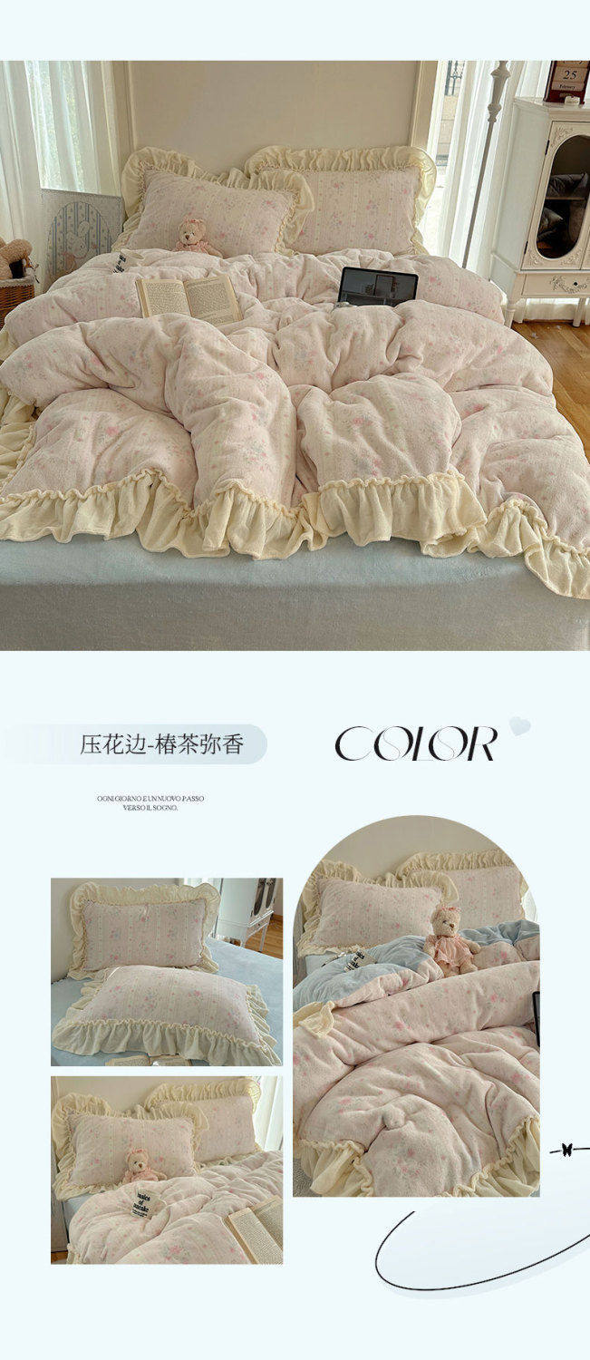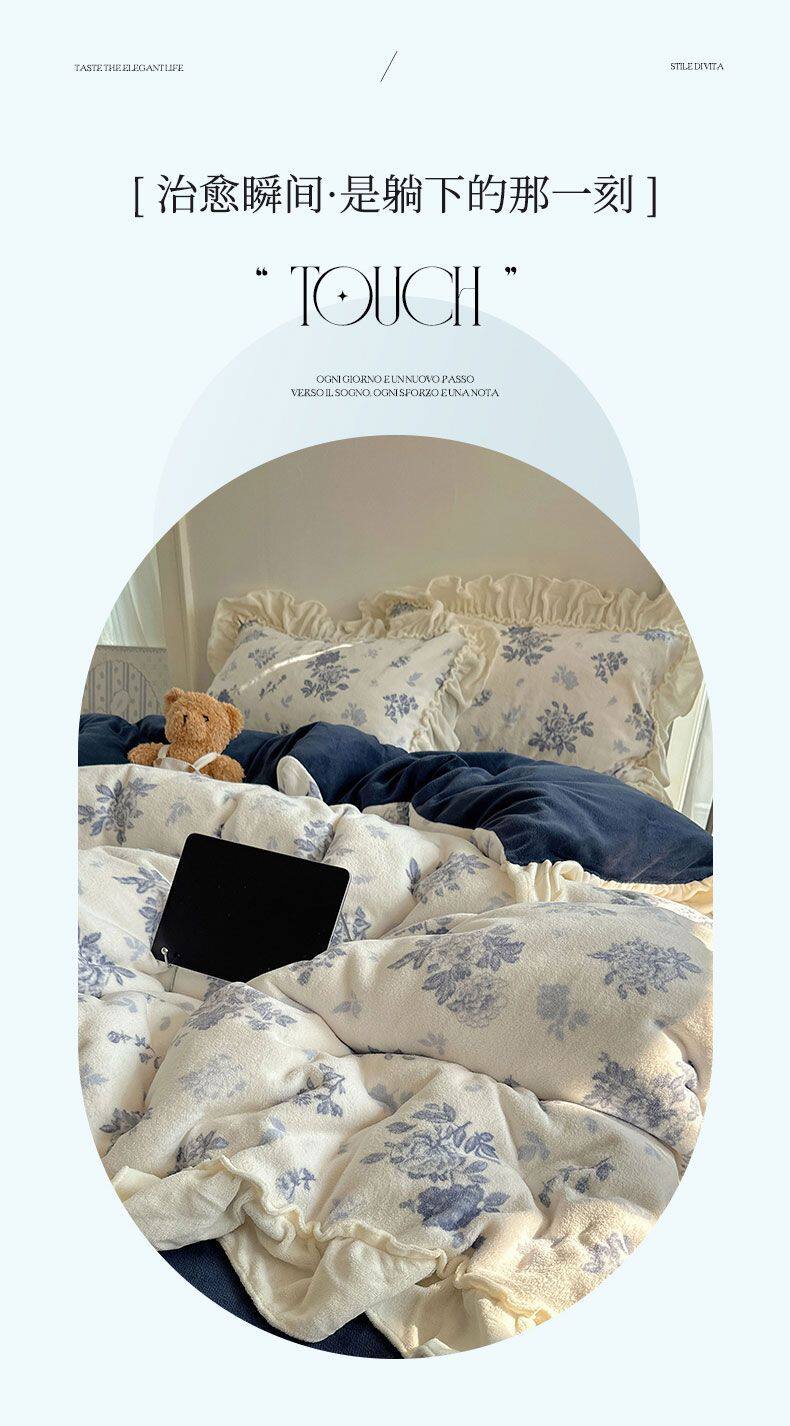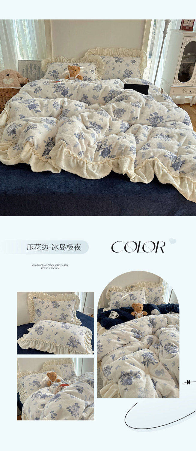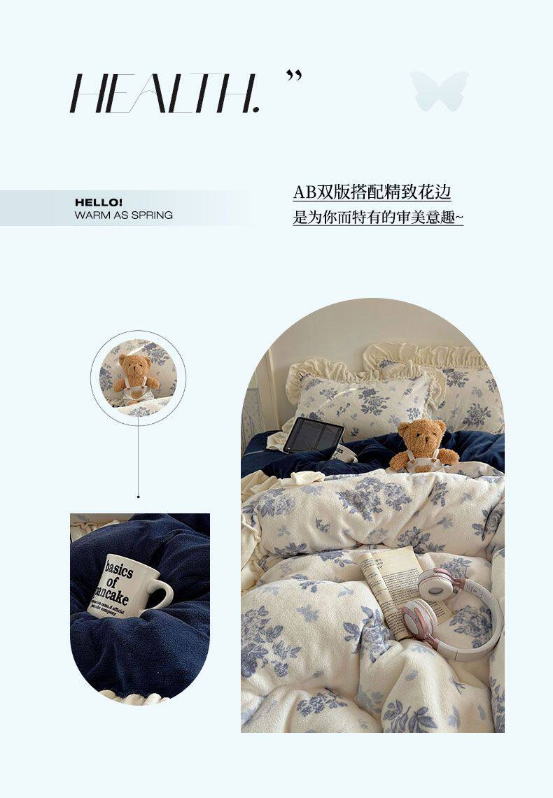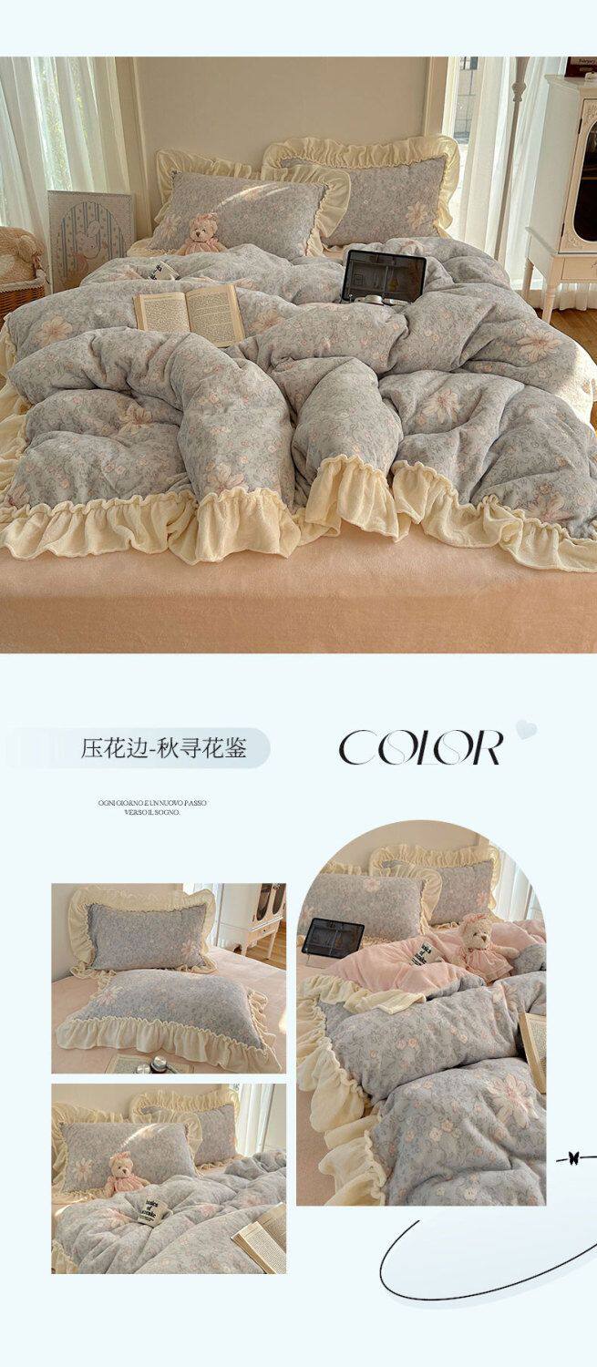 Korean Floral Lace Milk Velvet Four-Piece Winter Thickeneded Coral Velvet Quilt Cover Bed Sheets Flannel Three-Piece Set