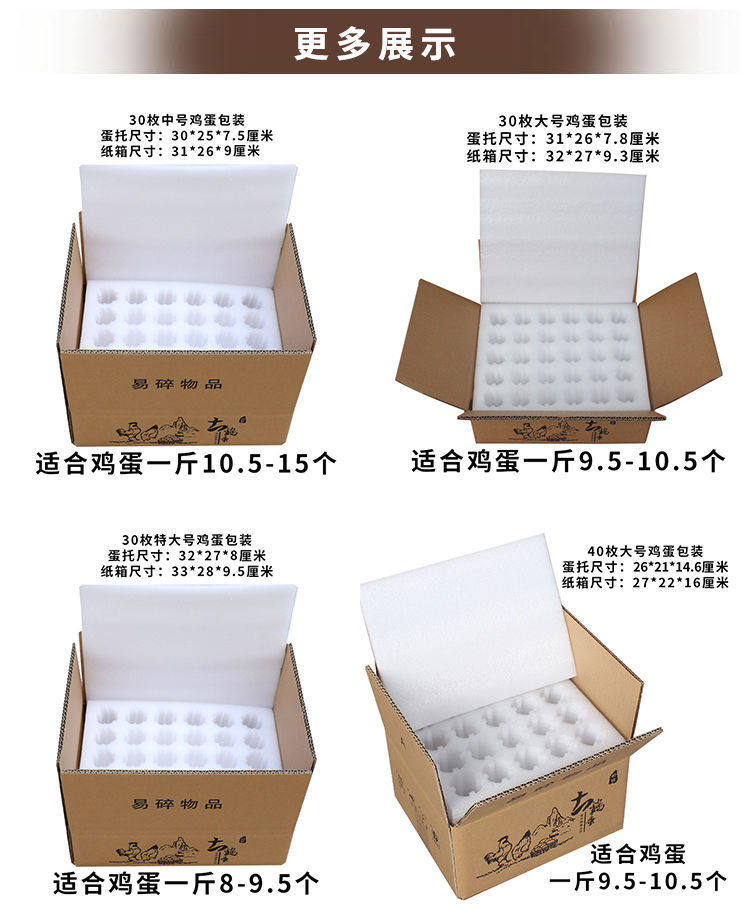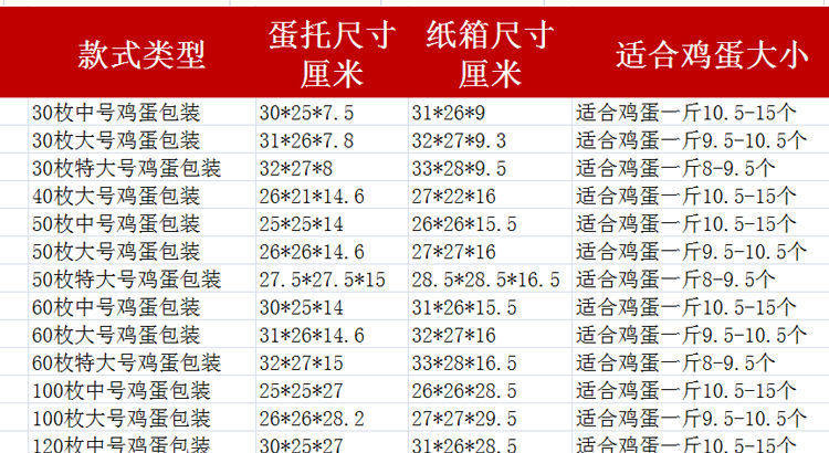 | Specifications and models | 30 medium egg trays,50 medium egg trays + carton,50 large egg trays + carton,50 extra large egg trays + carton,60 pieces medium egg tray + carton,60 large egg trays + carton,60 extra large egg trays + carton,30 medium egg trays + carton,30 large egg trays + carton,30 extra large egg trays + carton,100 pieces medium egg tray + carton,100 large egg trays + carton,100 extra large egg trays + carton,30 large egg trays,50 medium egg trays,50 large egg trays,40 large egg trays + carton |