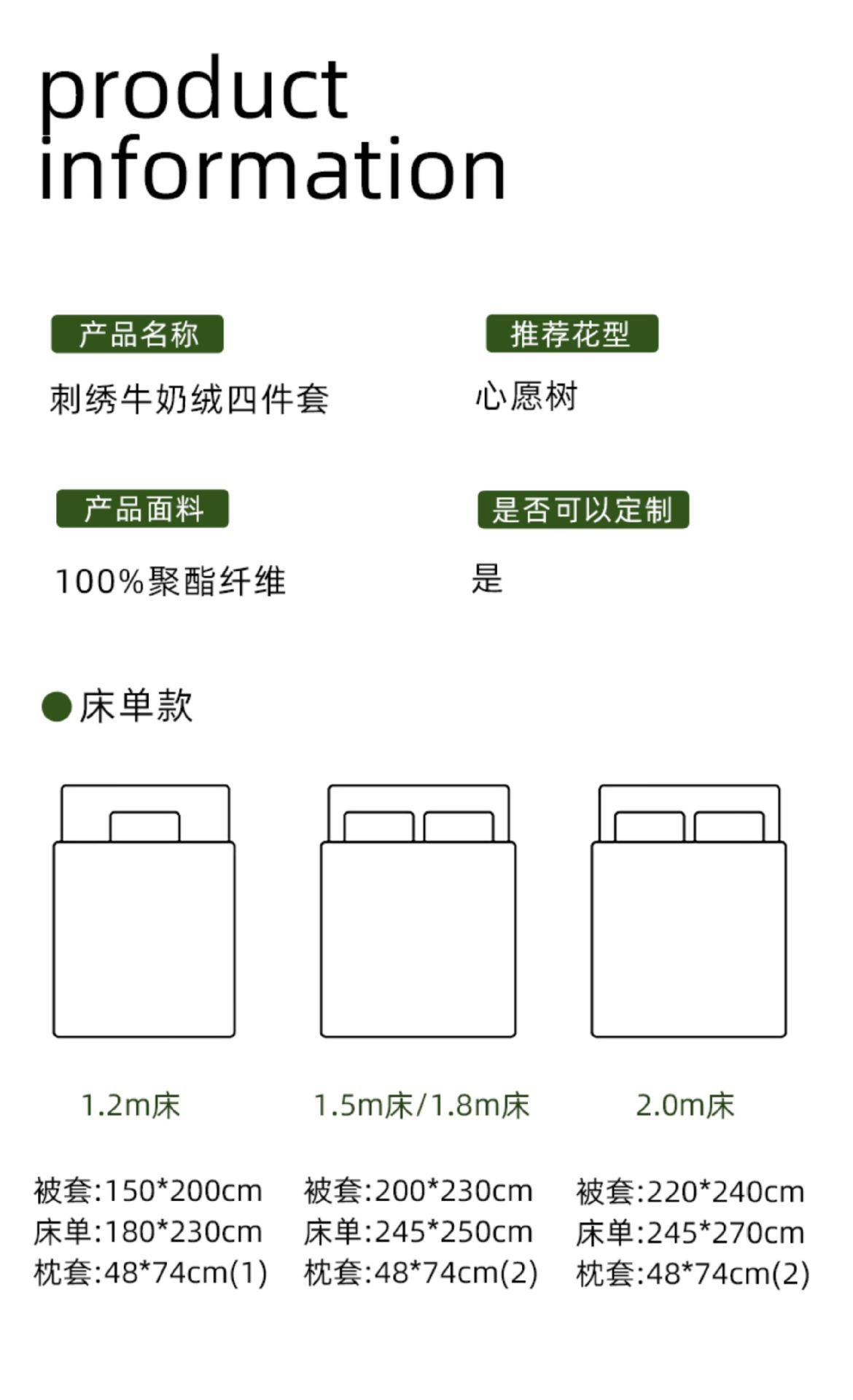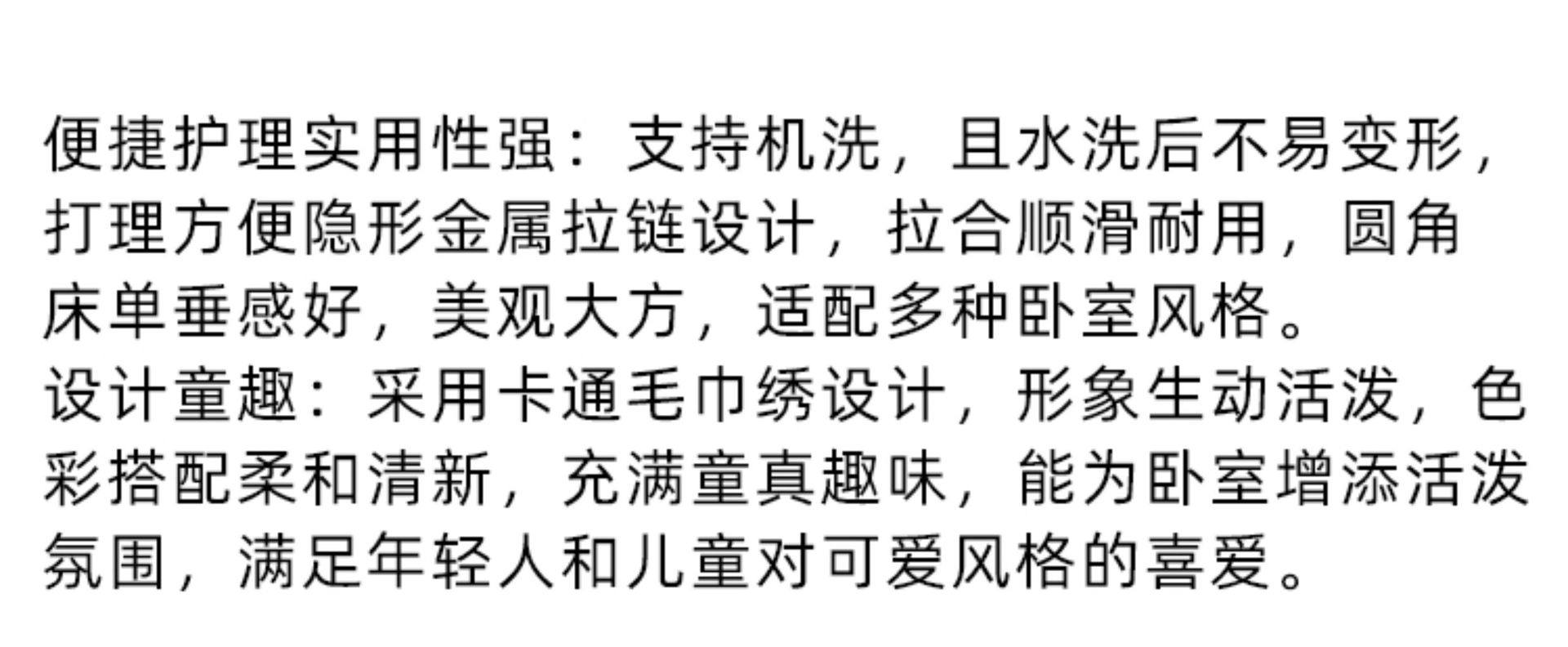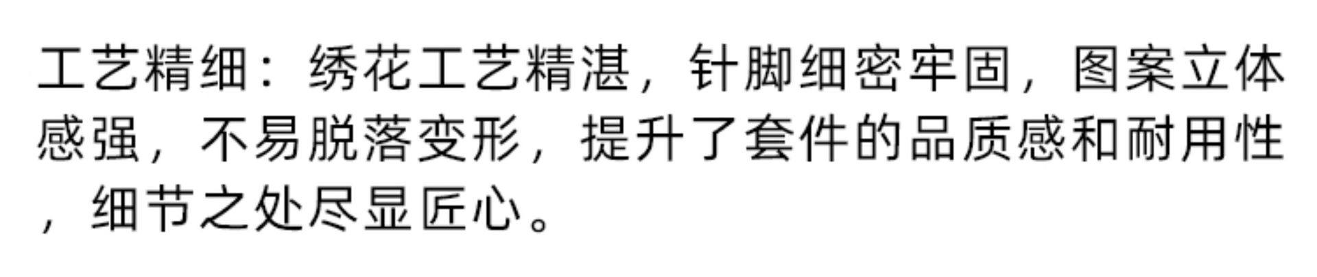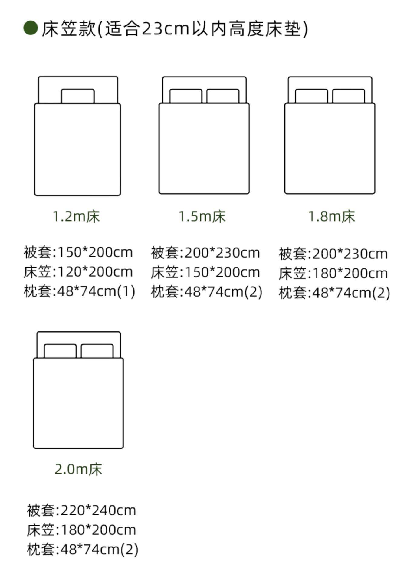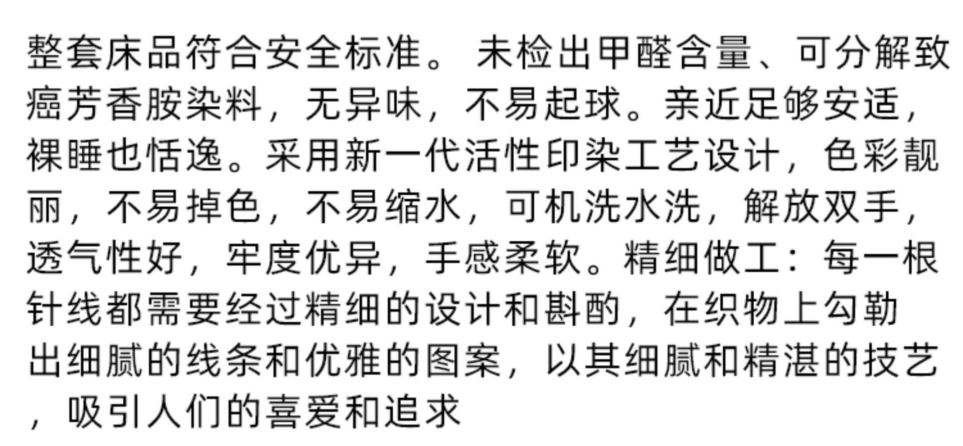 | Size specifications | 1.2 bed/duvet cover 150*200cm/three-piece set,1.5 bed/quilt cover 200*230cm/four-piece set,1.8 bed/quilt cover 200*230cm/four-piece set,2.0 bed/quilt cover 220*240cm/four-piece set,1.8 bed/oversized quilt cover 220*240cm/four-piece set,1.5m fitted sheet set of four,1.8m fitted sheet set of four |