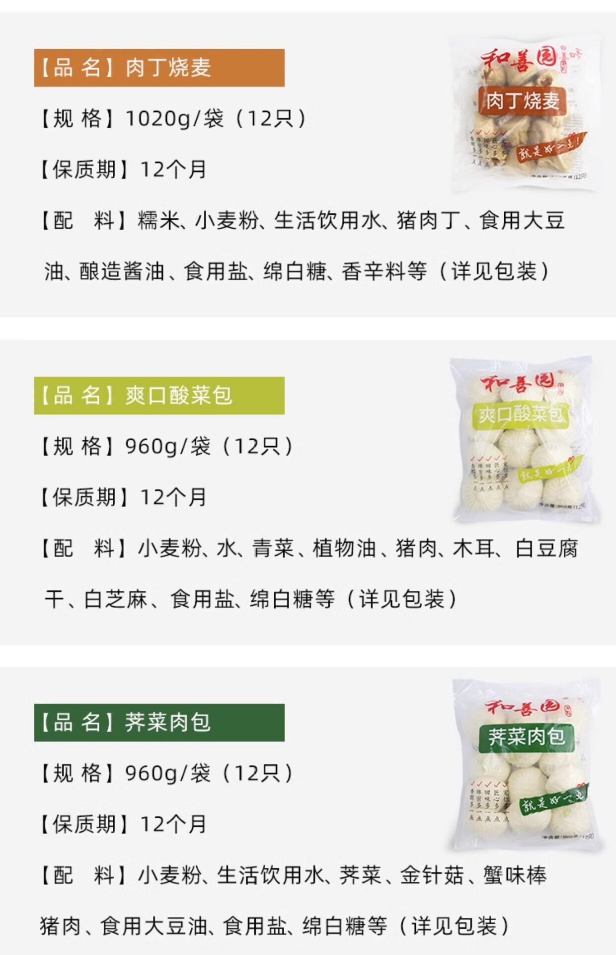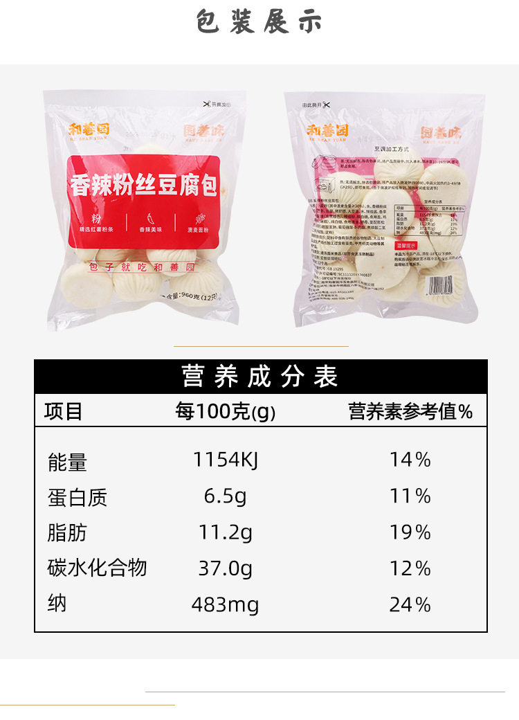 | Packaging specifications | Heshanyuan rose bean paste buns 960g/12 pieces,Heshanyuan vermicelli tofu buns 960g/12 pieces,Heshanyuan fresh meat buns 960g/12 pieces,Heshanyuan three fresh vegetable buns 960g/12 pieces,Heshanyuan shepherd's purse meat buns 960g/12 pieces,Heshanyuan umeboshi vegetable meat buns 960g/12 pieces,Heshanyuan refreshing sauerkraut buns 960g/12 pieces,Heshanyuan diced pork siomai 1020g/12 pieces,Heshanyuan braised pork sanding paper shaomai 360g/6 pieces |