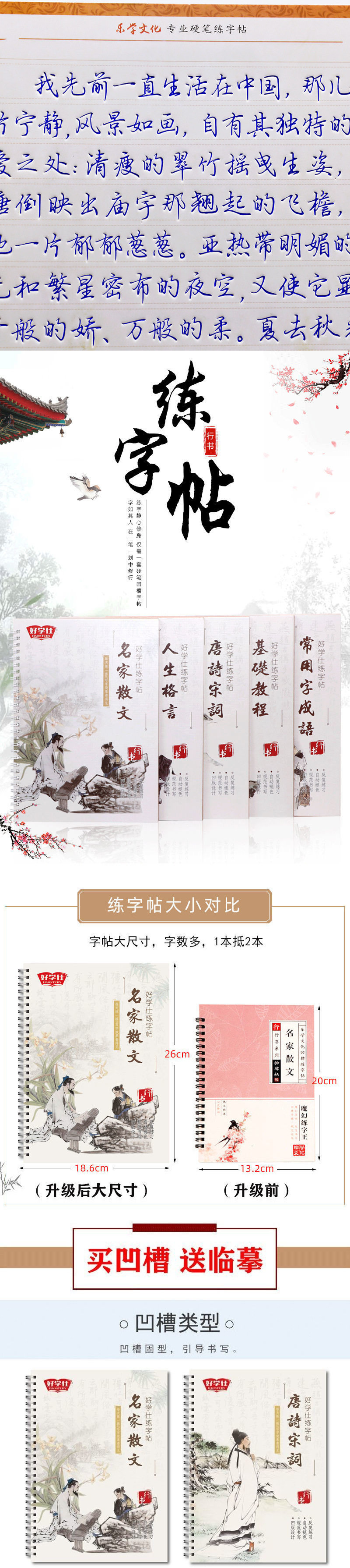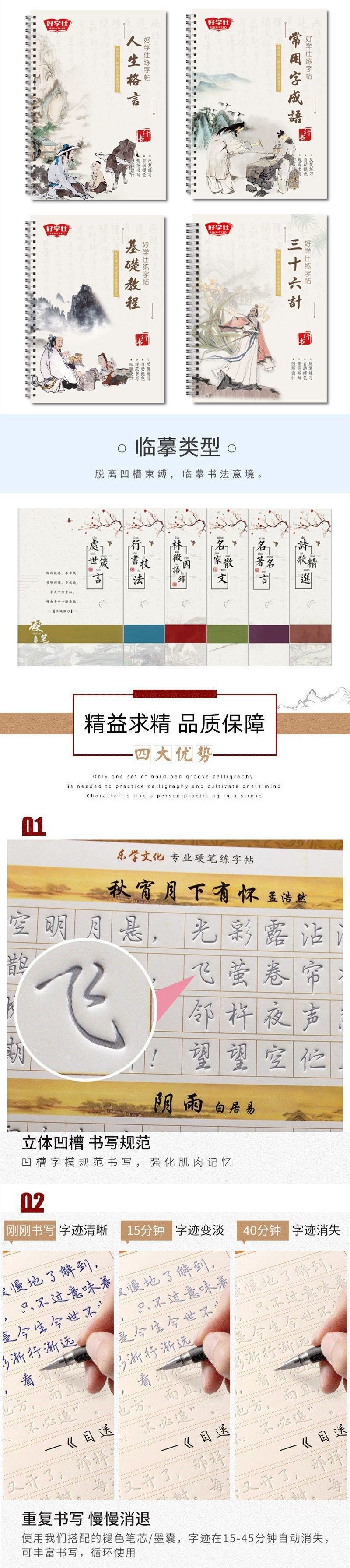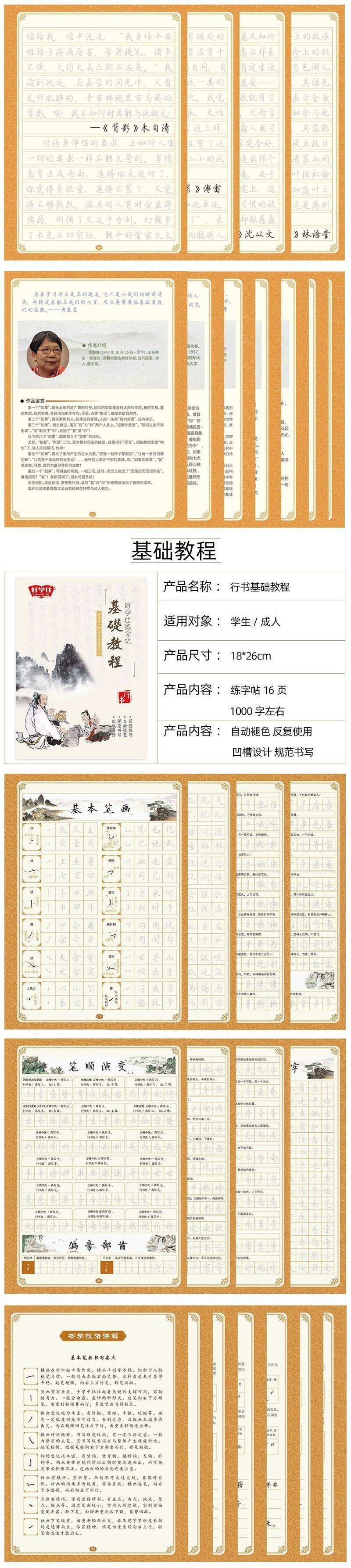 Specifications [full set of 5 running scripts] + 3 free copies,[4 books recommended for adults] + 2 free copies,[4 books recommended by students] + 2 free copies,Basic knowledge + commonly used words + famous writers’ prose + free 2 copies,Basic knowledge + commonly used words + tang poetry and song lyrics + free 2 copies for copying,Commonly used words + tang poetry + famous writers' prose + free 2 copies,Chinese classics + thirty-six strategies + prose + free 2 copies,Basic knowledge + commonly used words + 2 copies [recommended for beginners],【life motto】,[prose by famous writers],[basic tutorial],[tang poetry and song ci],[chinese classics],【thirty-six strategies】,[commonly used words and idioms]