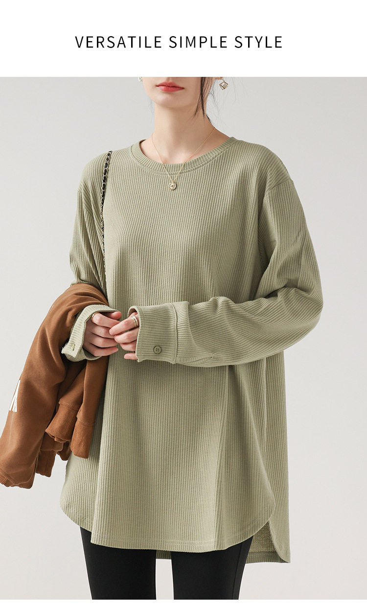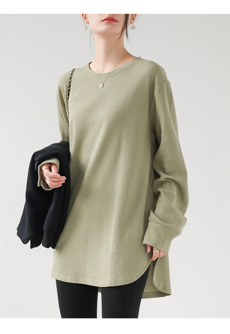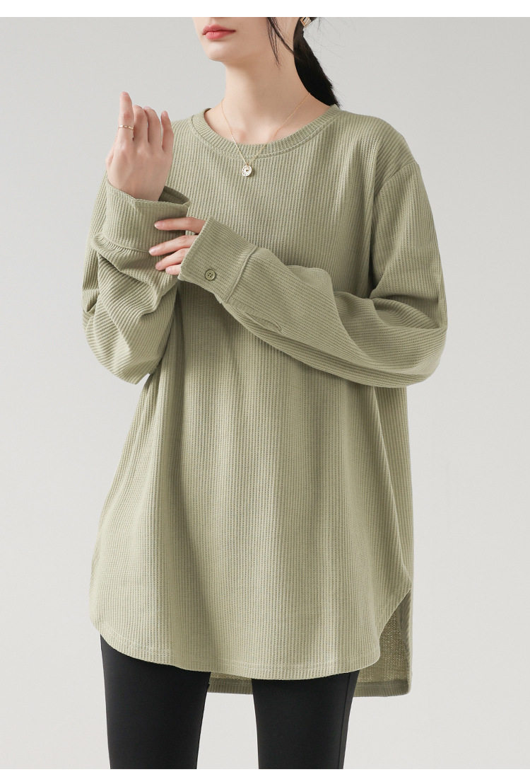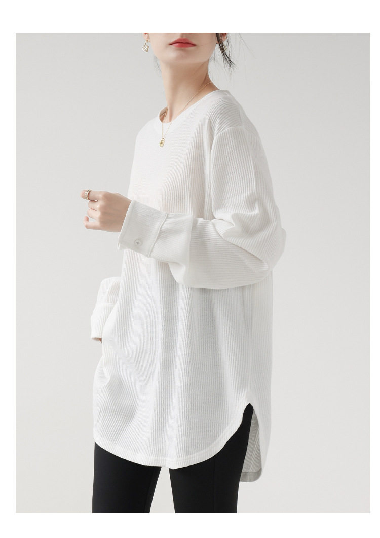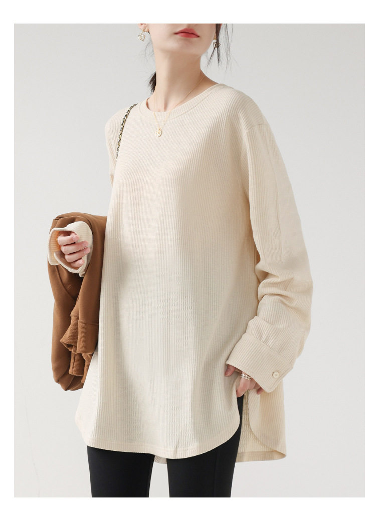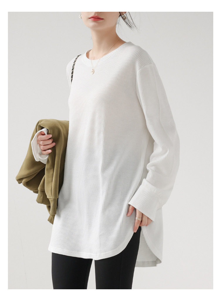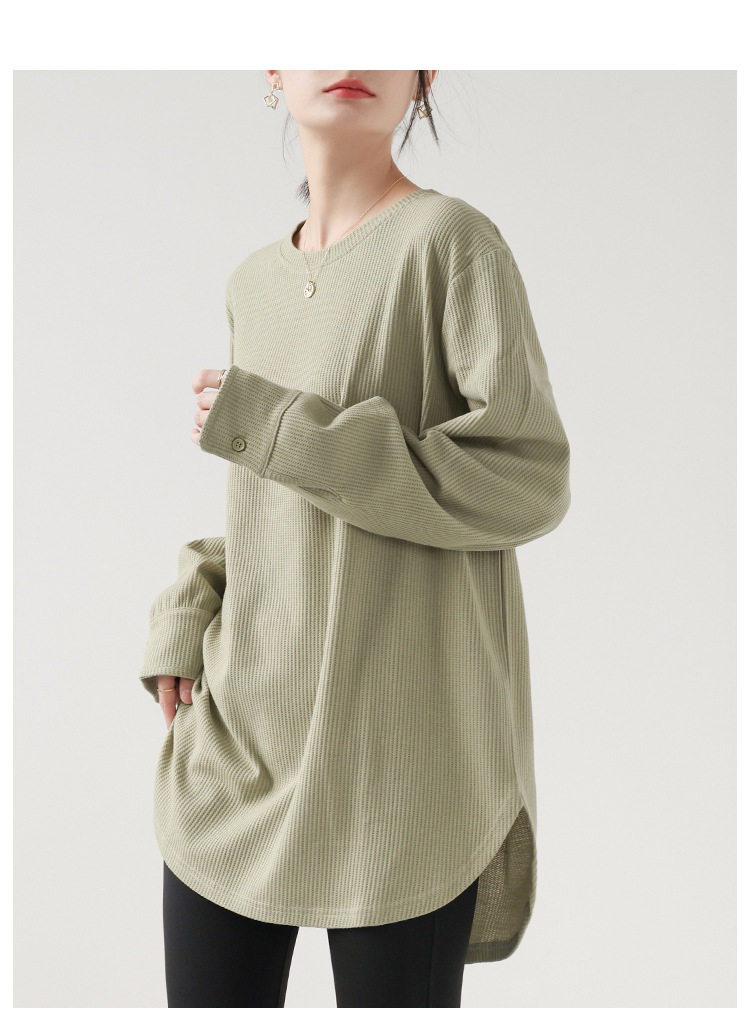 Waffle Butt-Covering Long-Sleeved T-Shirt for Women in Spring & Fall, Pregnant Women's Inner Arc Top, Mid-Length Loose Bottoming Shirt