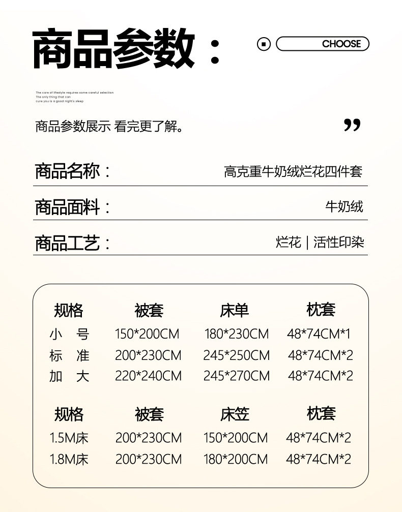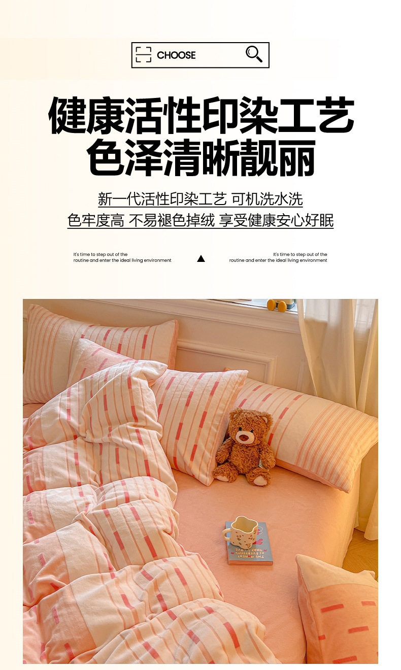 | Size specifications | 1.2m bed three-piece set (quilt cover 150*200, sheets 180*230, pillowcase 48*74*1),1.5m bed four-piece set (quilt cover 200*230, sheets 245*245, pillowcase 48*74*2),1.8m bed four-piece set (quilt cover 200*230, sheets 245*245, pillowcase 48*74*2),1.5m fitted sheet set of four,1.8m fitted sheet four-piece set,2.0m bed sheet four-piece set |