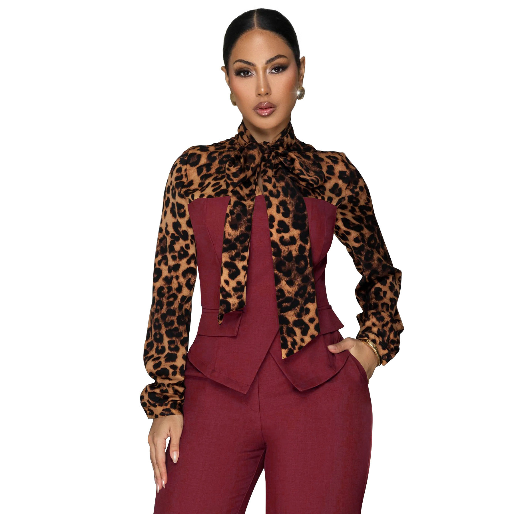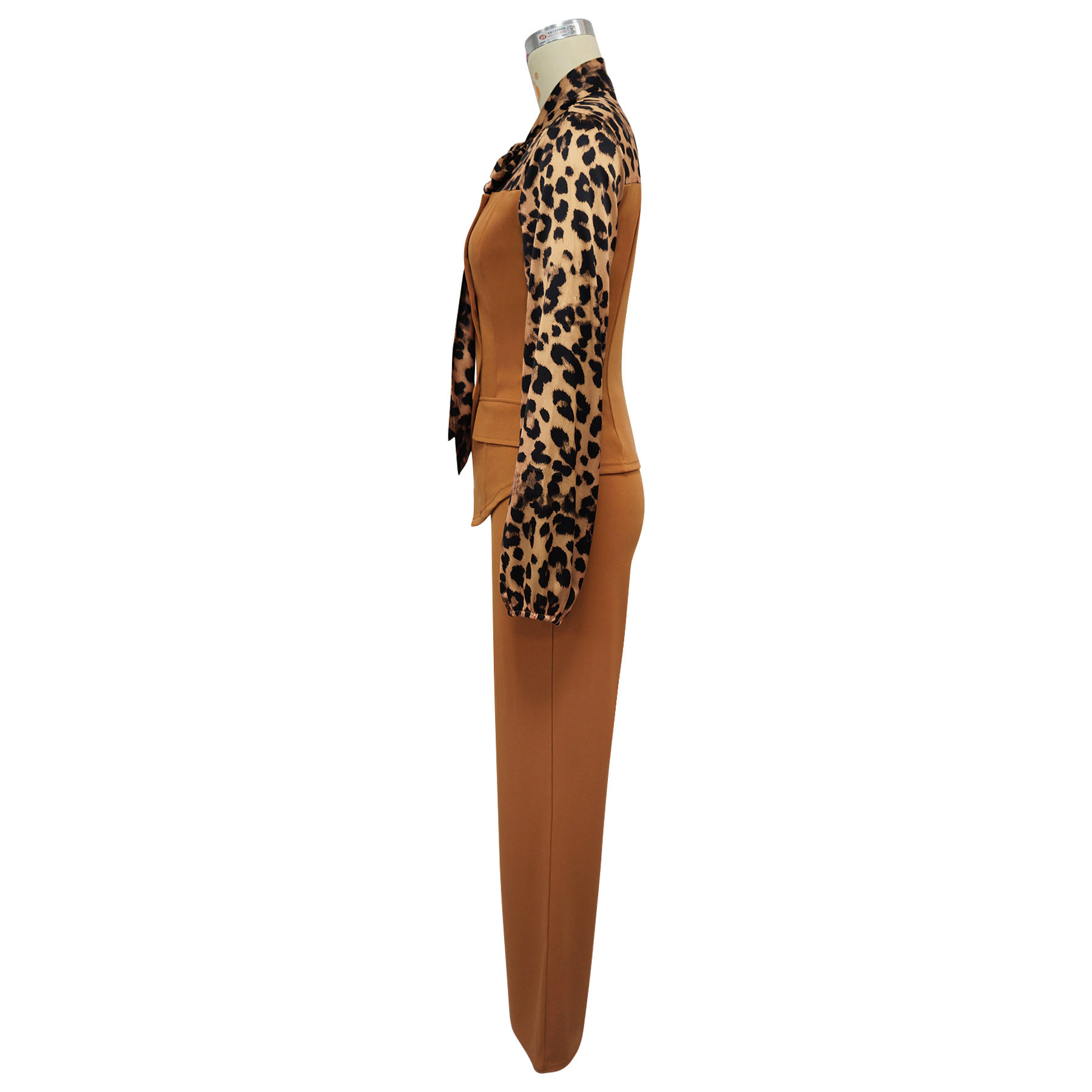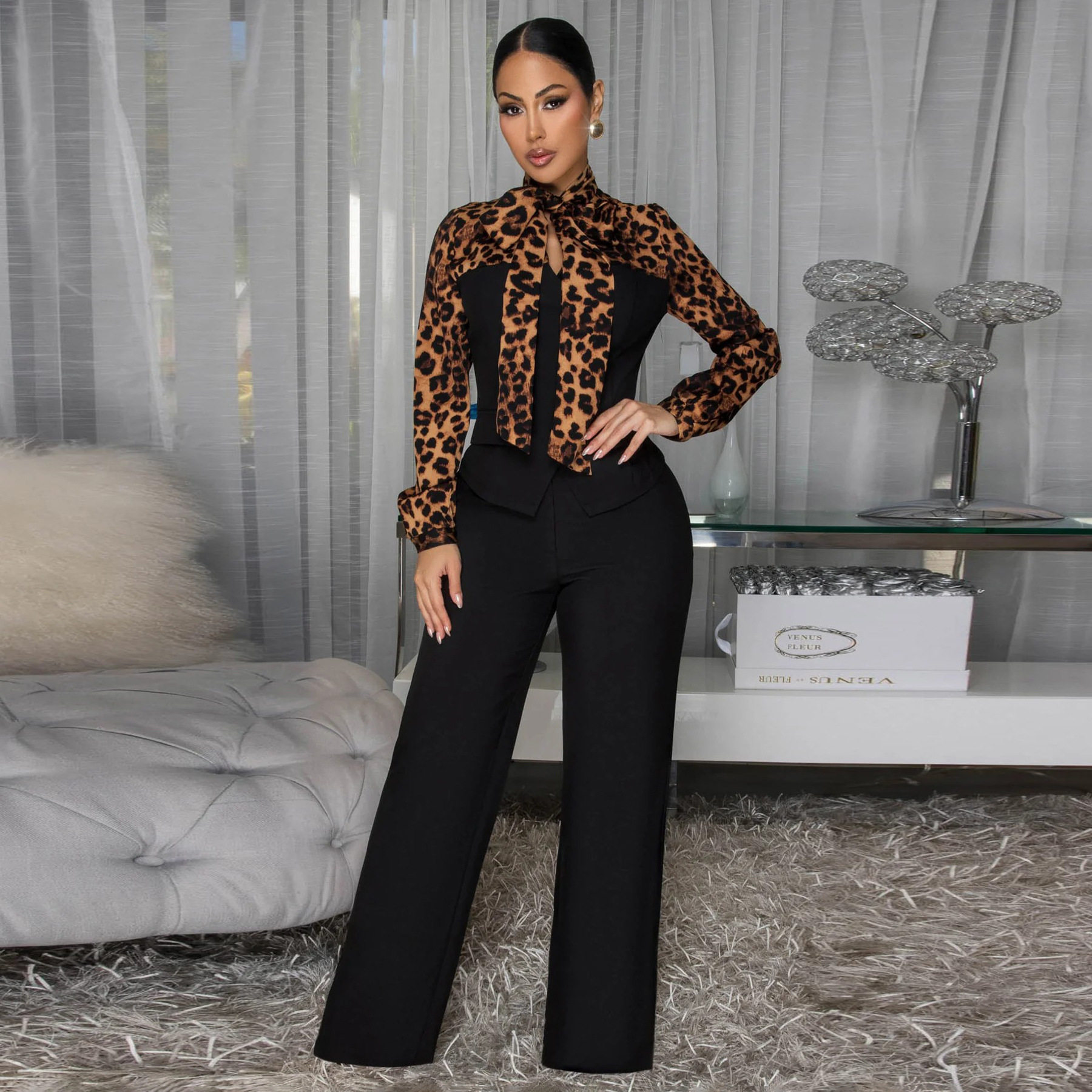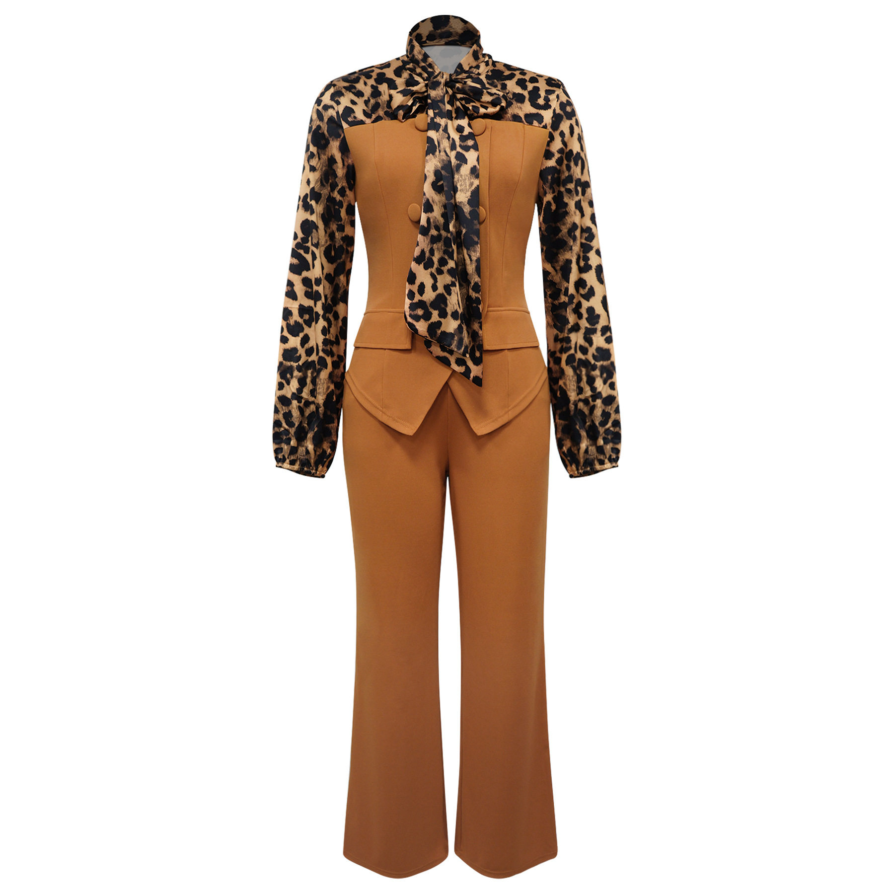 934 Cross-Border Exclusive Amazon Autumn Popular European and American Fashion Women's Leopard Print Tie Shirt Casual Set