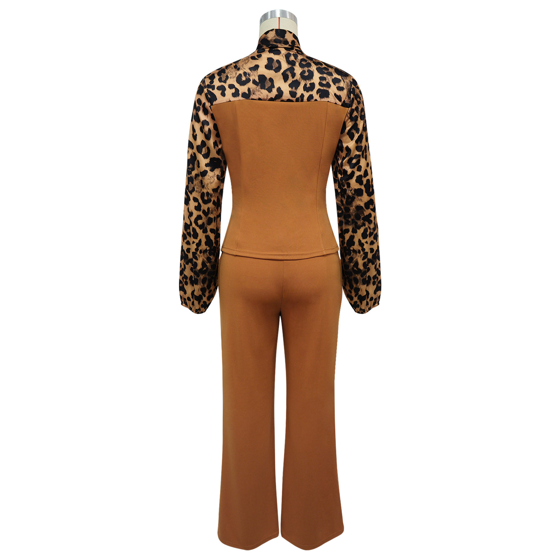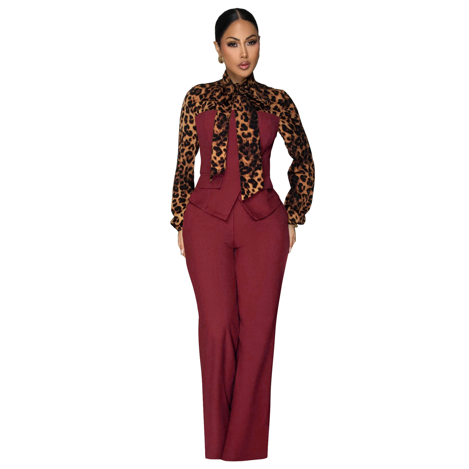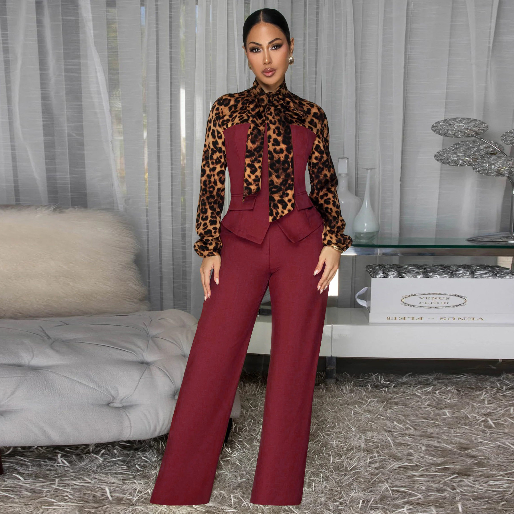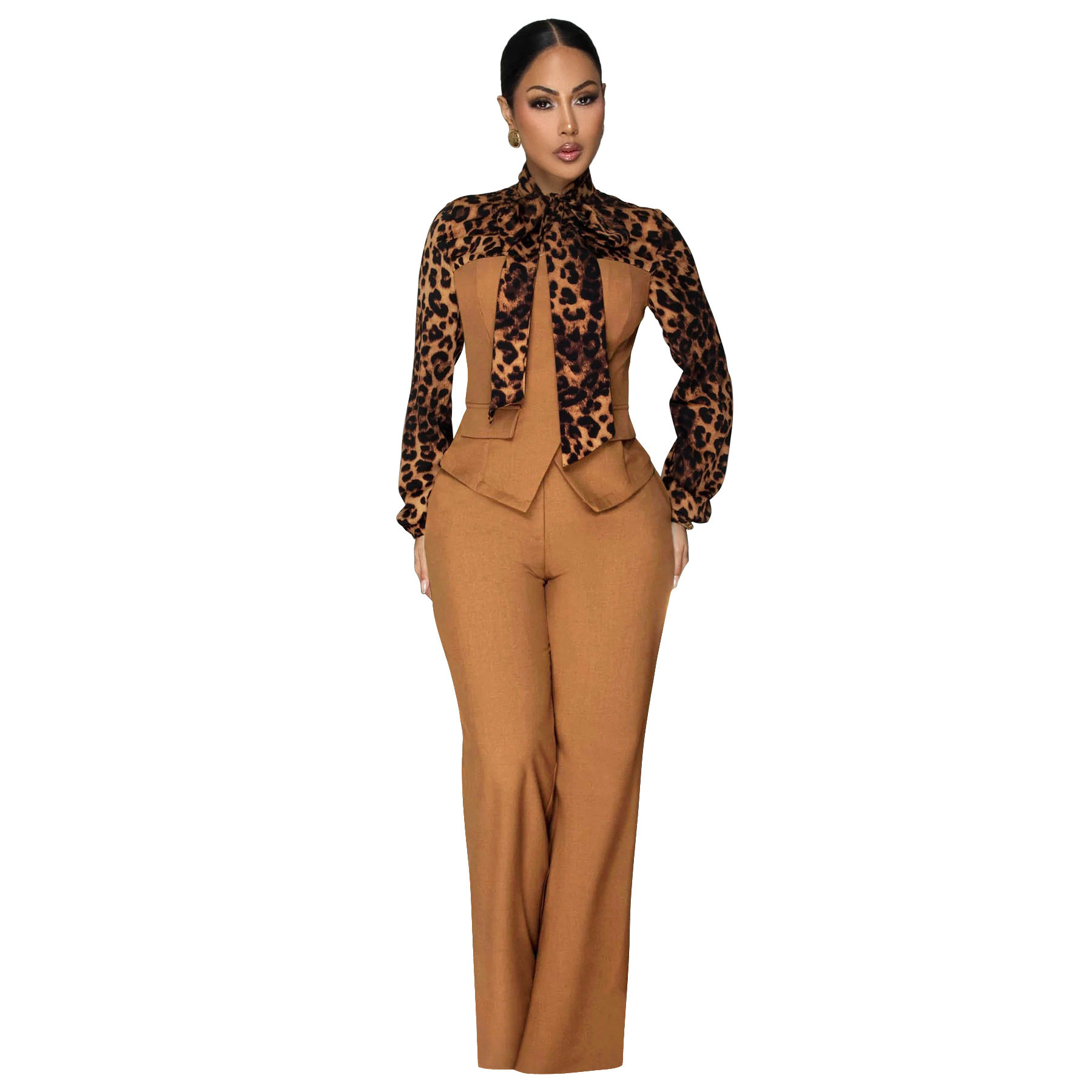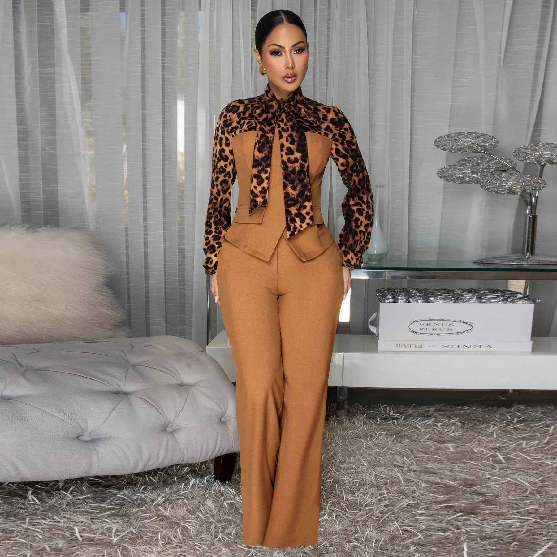 934 Cross-Border Exclusive Amazon Autumn Popular European and American Fashion Women's Leopard Print Tie Shirt Casual Set