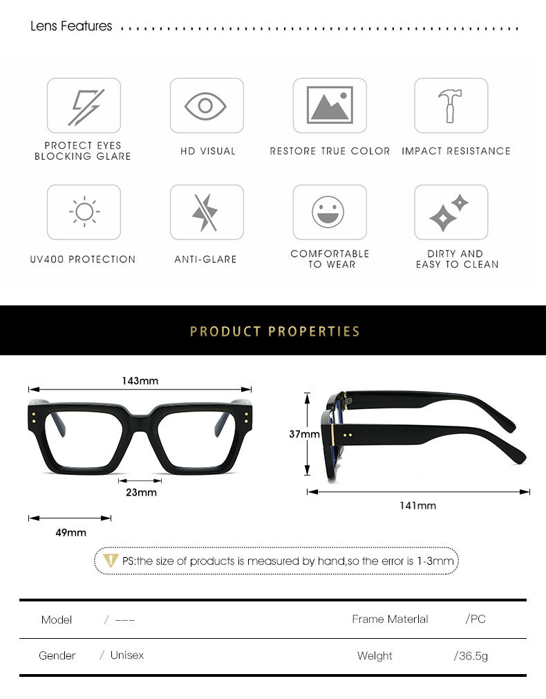 | Lens color | Bright black frame transparent film,Black frame transparent flower leg film,Tortoiseshell framed transparent sheet,Orange frame transparent film,Tea frame transparent sheet,White frame transparent film |