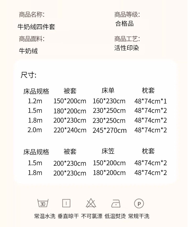 | Size specifications | 1.2m three-piece bed sheet set [sheet 160x230 quilt cover 150x200],1.5m four-piece bed sheet set [sheet 230x250 quilt cover 180x200],1.8m four-piece bed sheet set [bed sheet 230x250 quilt cover 200x230],2.0m four-piece bed sheet set [bed sheet 245x270 quilt cover 220x240],1.5m four-piece set of fitted sheets [fitted sheet 150x200 quilt cover 200x230],1.8m four-piece fitted sheet set [fitted sheet 180x200 quilt cover 200x230] |