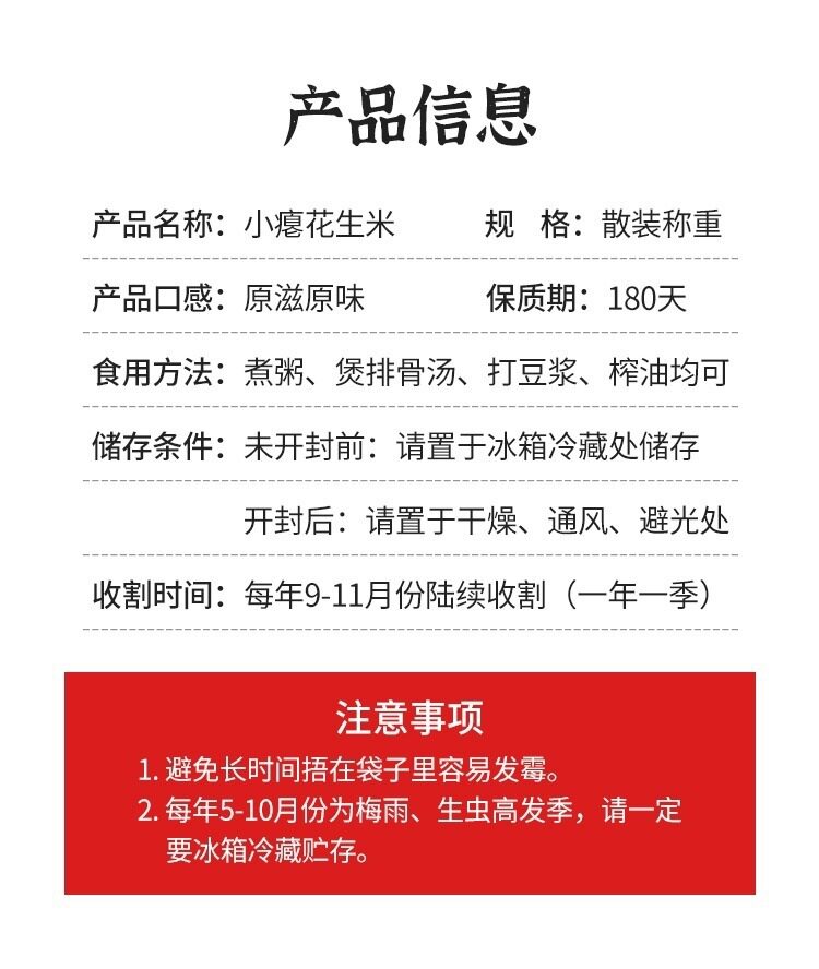 | Packaging specifications | 0.5kg (1 can) hand-selected high quality,【0.5kg (sweet and flat peanuts) suitable for raw consumption】,1.0kg (2 cans) hand-selected high quality,1.5kg (3 cans) hand-selected high quality,2kg (4 cans) hand-selected high quality,2.5kg (5 cans) hand-selected high quality,【1.0kg (sweet and flat peanuts) suitable for raw consumption】,【1.5kg (sweet and flat peanuts) suitable for raw consumption】,【2.5kg (sweet and flat peanuts) suitable for raw consumption】 |
