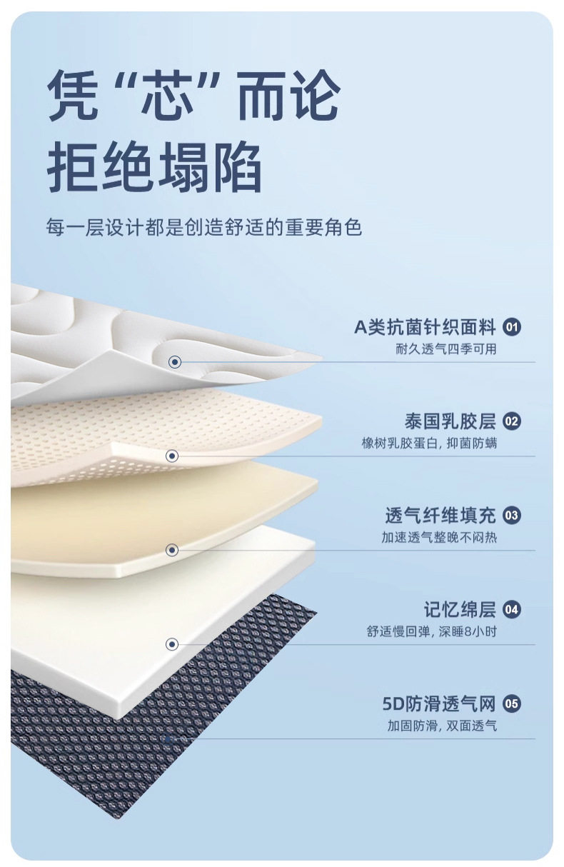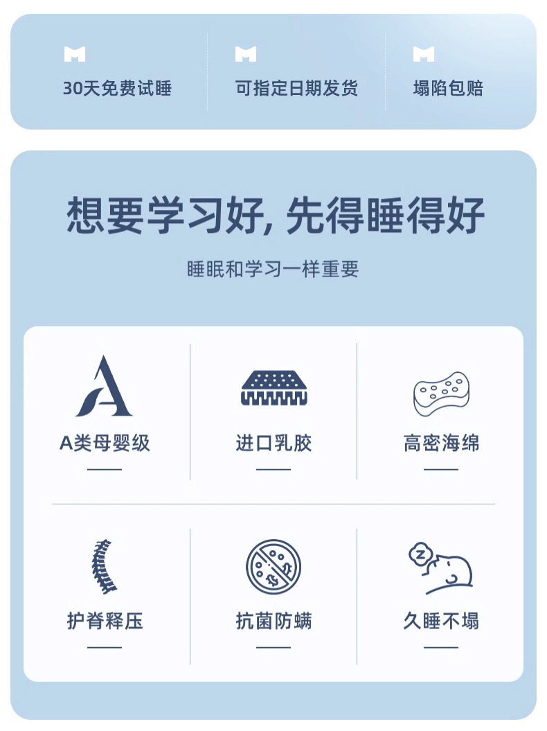 | Size specifications | Student bed: 80*190cm [thai latex | slow rebound memory foam | collapse compensation],Student bed: 90*190cm [thai latex | slow rebound memory foam | collapse compensation],Student bed: 90*200cm [thai latex | slow rebound memory foam | collapse compensation],Single bed: 120*190cm [thai latex | slow rebound memory foam | collapse compensation],Single bed: 120*200cm [thai latex | slow rebound memory foam | collapse compensation],Double bed: 150*190cm [thai latex | slow rebound memory foam | collapse compensation],Double bed: 150*200cm [thai latex | slow rebound memory foam | collapse compensation],Double bed: 180*200cm [thai latex | slow rebound memory foam | collapse compensation],Double bed: 200*220cm [thai latex | slow rebound memory foam | collapse compensation] |