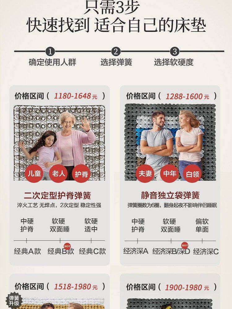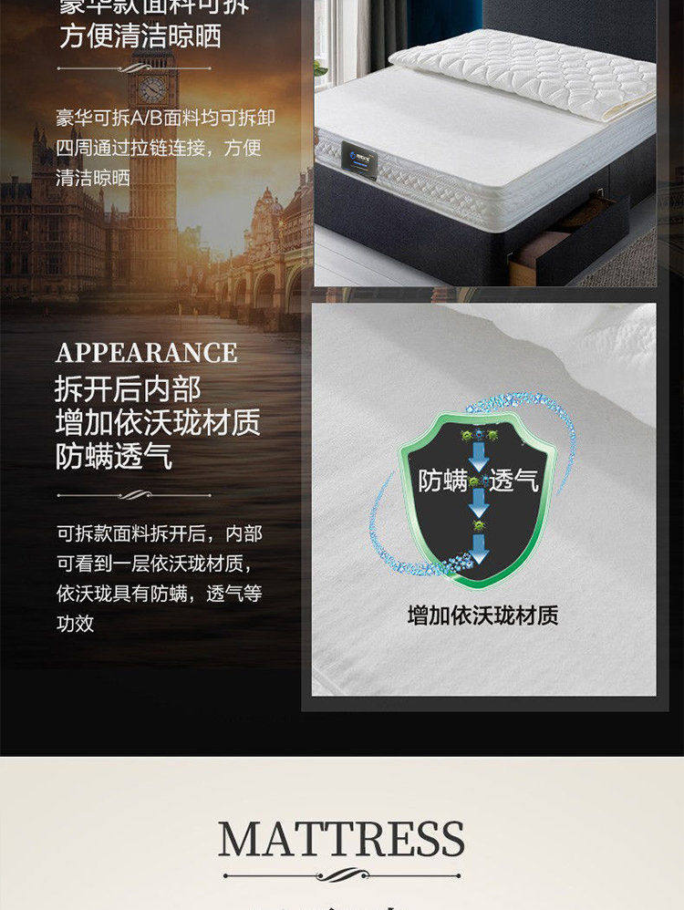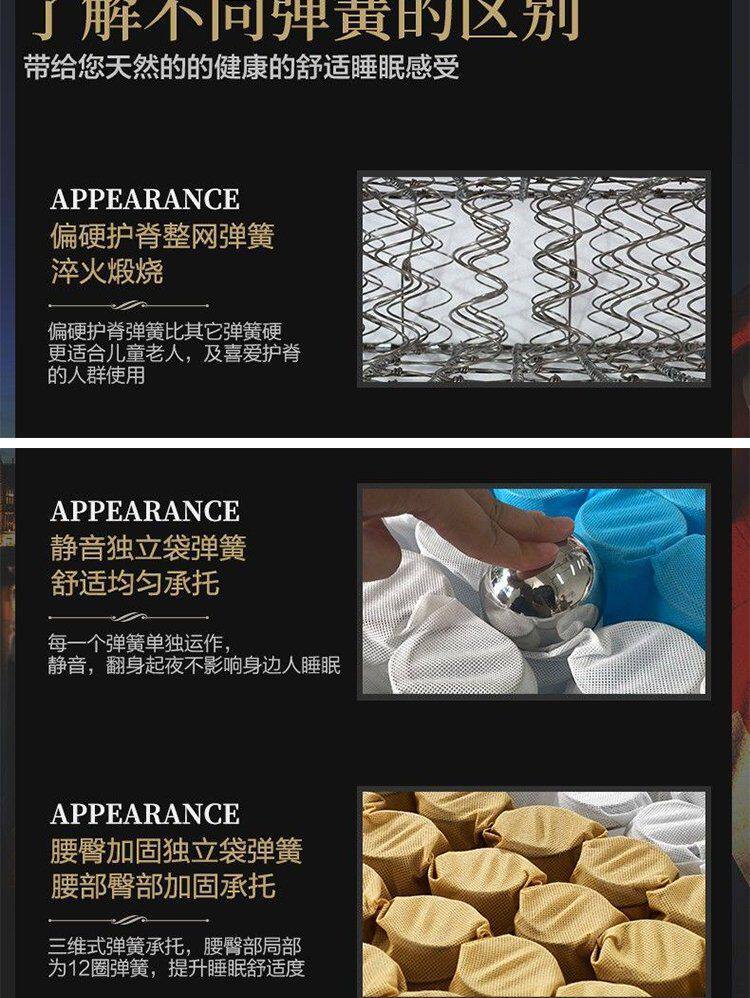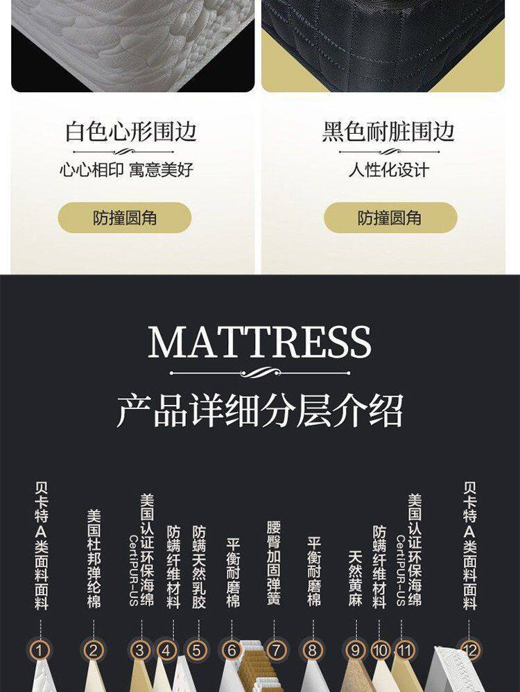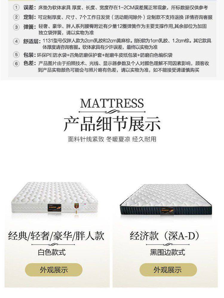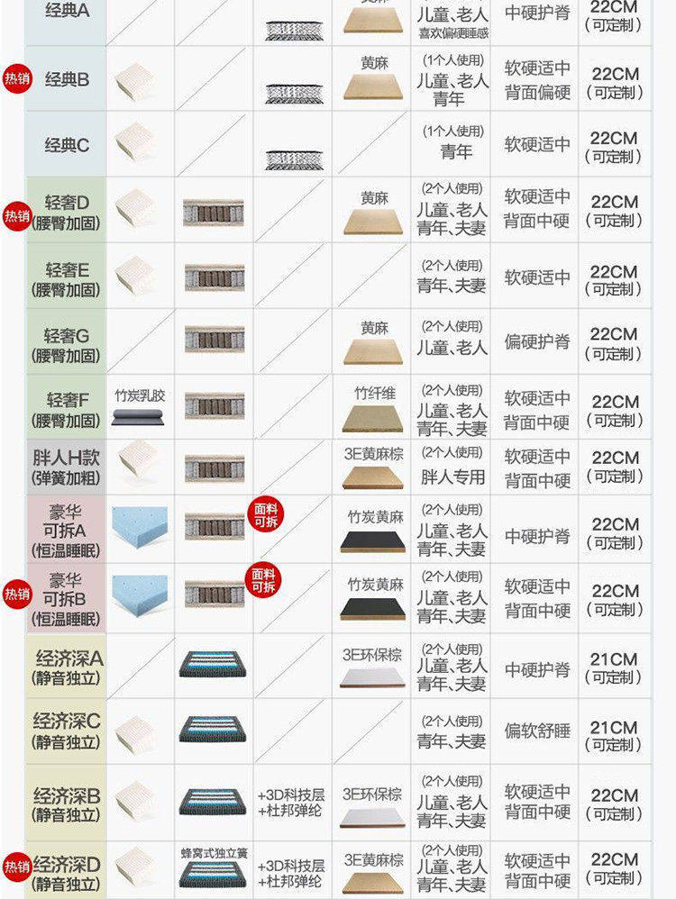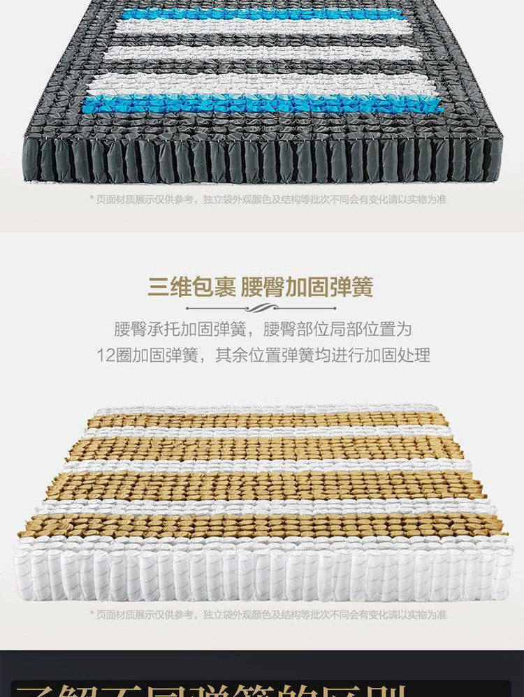 | Color | Standard a [high-strength whole-net spring] moderate softness and hardness,Standard b [high-strength whole-net spring] is a bit hard,Standard c [high-strength whole-net spring] is soft,Classic a [secondary shaped spine spring] medium hard,Classic b [secondary shaped spine spring] soft and hard dual use,Classic c [secondary shaping spine spring] moderate,Light luxury d [waist and hip reinforced with 12-circle springs] double-sided sleeping,Light luxury e [waist and hip reinforced with 12-circle springs] moderate,Light luxury f [waist and hip reinforced with 12-circle springs] double-sided sleeping,Light luxury g [waist and hip reinforced 12-circle spring] spine protection,Luxurious detachable b [reinforced 12-turn spring] double-sided sleeping,Luxurious detachable a [reinforced 12-turn spring] double-sided sleeping,Fat person h [bold and reinforced 100kg and above] sleeps on both sides |