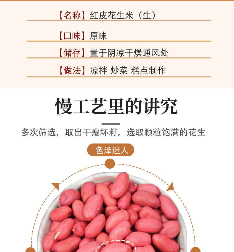 | Packaging specifications | Selected red skin peanuts 2.5kg [new arrivals this year],Selected red skin peanuts 1.5kg [new arrivals this year],Selected red skin peanuts 1.0kg [new arrivals this year],Selected red-skinned peanuts 28g [new product launched this year] |