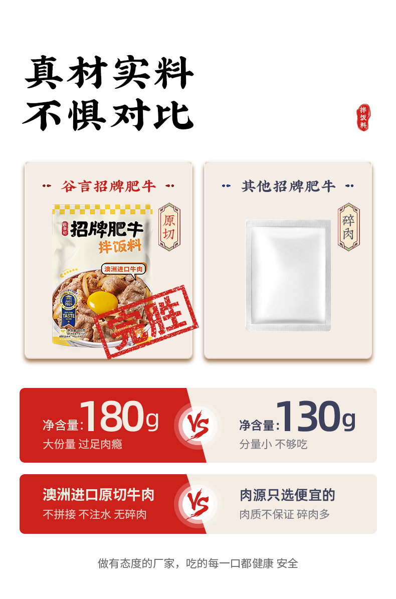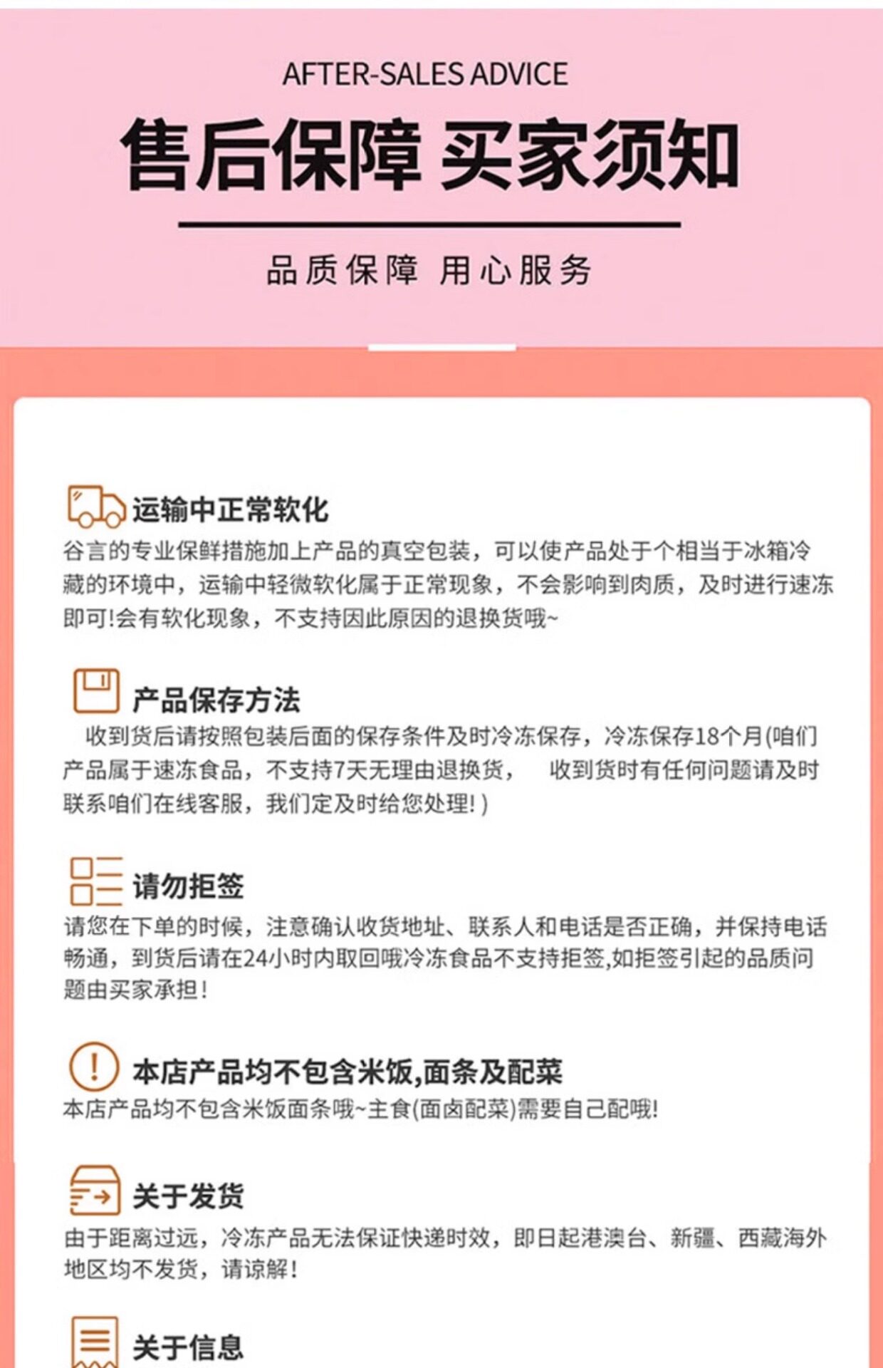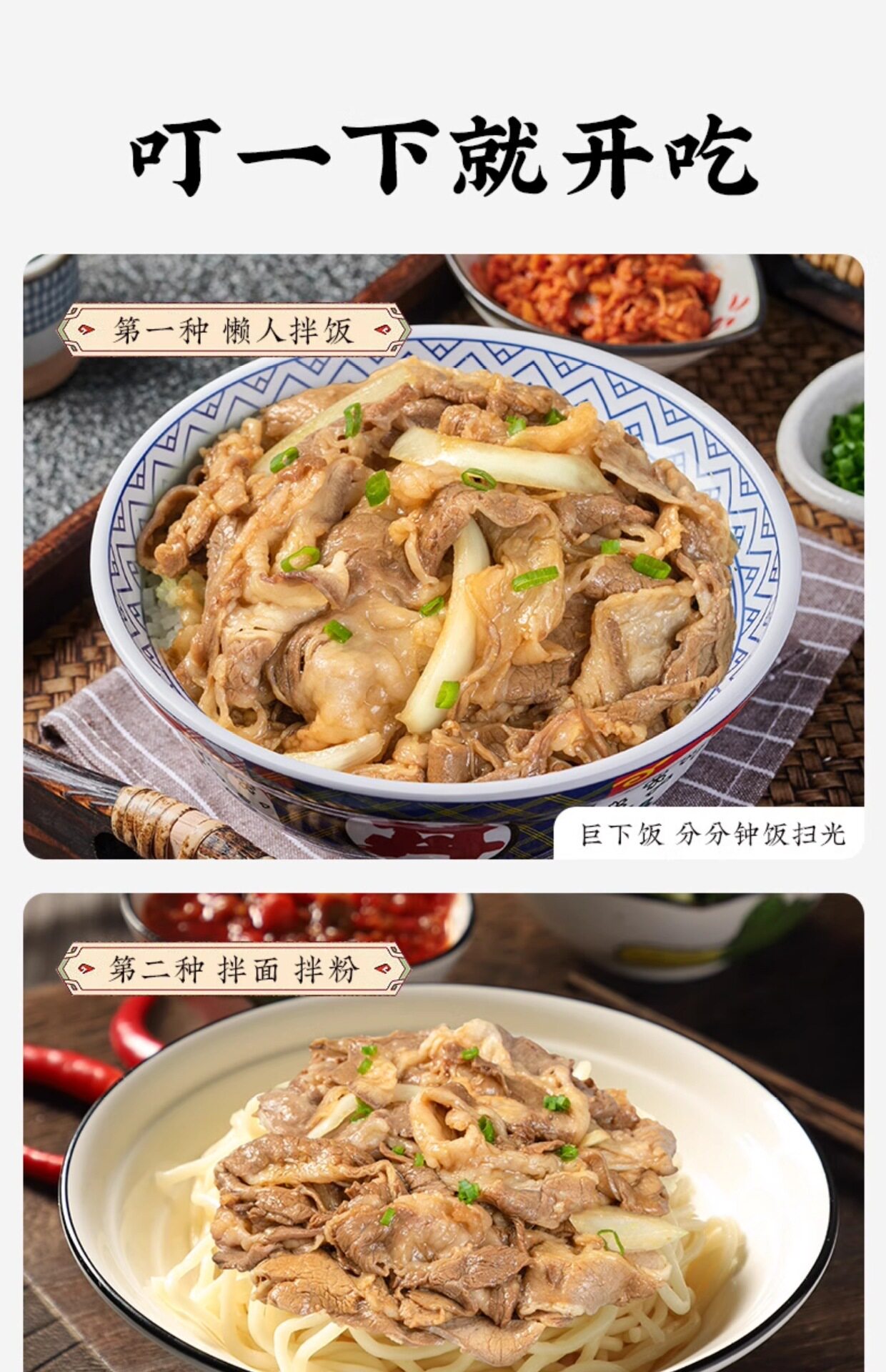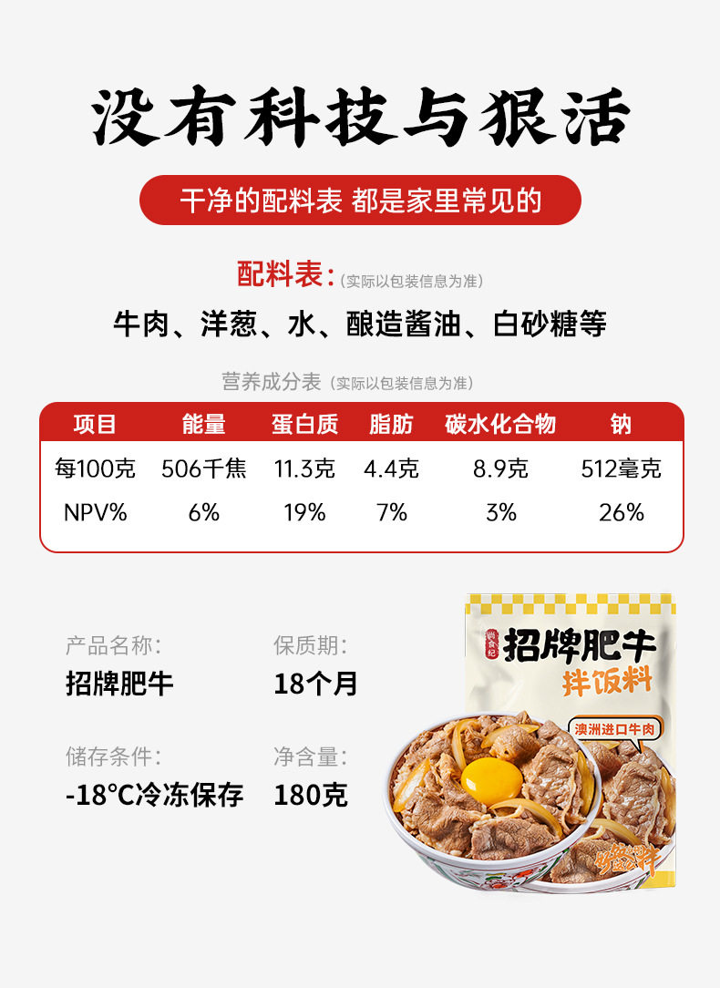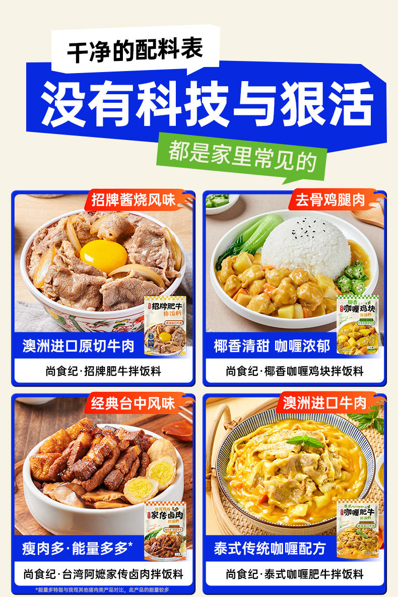 | Packaging specifications | Fatty beef + braised pork + curry chicken + curry fatty beef + fish-flavored shredded pork (980g),2 bags of fat beef + 2 bags of braised pork + 2 bags of curry chicken (1160g),3 bags of beef rice + 3 bags of braised pork rice (1140g),3 bags of beef rice + 3 bags of curry chicken (1140g),3 bags of braised pork rice + 3 bags of curry chicken (1140g),Signature fatty beef 180g*10 bags (1800g),Grandma's braised pork 200g*10 bags (2000g),Coconut curry chicken 200g*10 bags (2000g),Chuifu fish flavor shredded pork 200g*10 bags (2000g),Thai curry beef 200g*10 bags (2000g) |