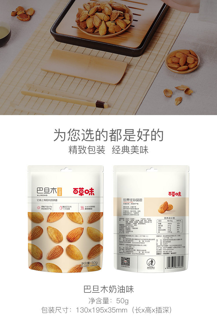 | Packaging specifications | Almond wood 50g (cream flavor),[baicao flavor] almond 100g |