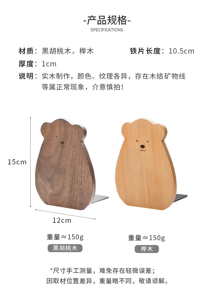 | Color | Beech round head bookend (13*8),Beech square head bookend (13*8),Black walnut round head bookend (13*8),Black walnut wood bookends with square ends (13*8 cm),Beech round head bookend (17*12),Beech square head bookend (17*12),Black walnut round head bookend (17*12),Black walnut square head bookend (17*12),Ebony bookend (13*8),Beech bear bookend,Black walnut bear bookends,Beechwood smiley face bookends,Black walnut smiley face bookends |