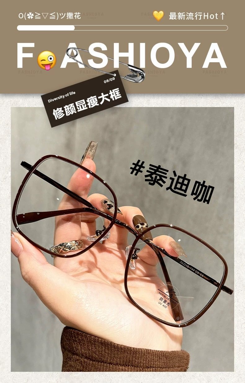 2989 Large Frame Brown Glasses for Short-Sighted Women Can Be Equipped with Prescription Lenses, High-End Large Face Anti-Blue Light Eye Frames
