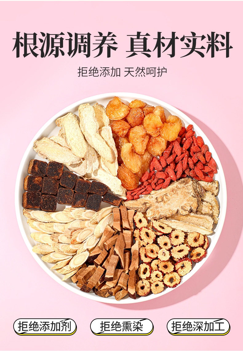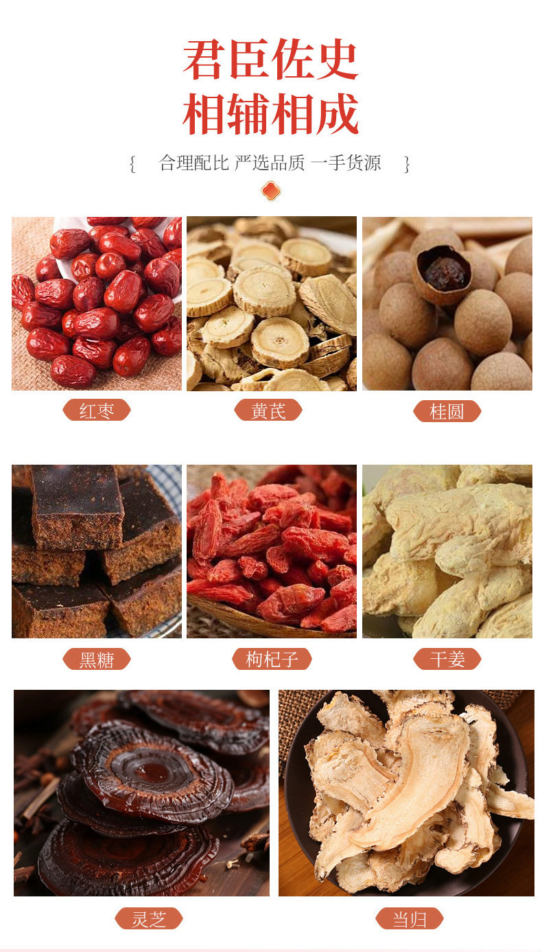 | Raw materials and ingredients | Angelica, astragalus, ginger, date, brown sugar |