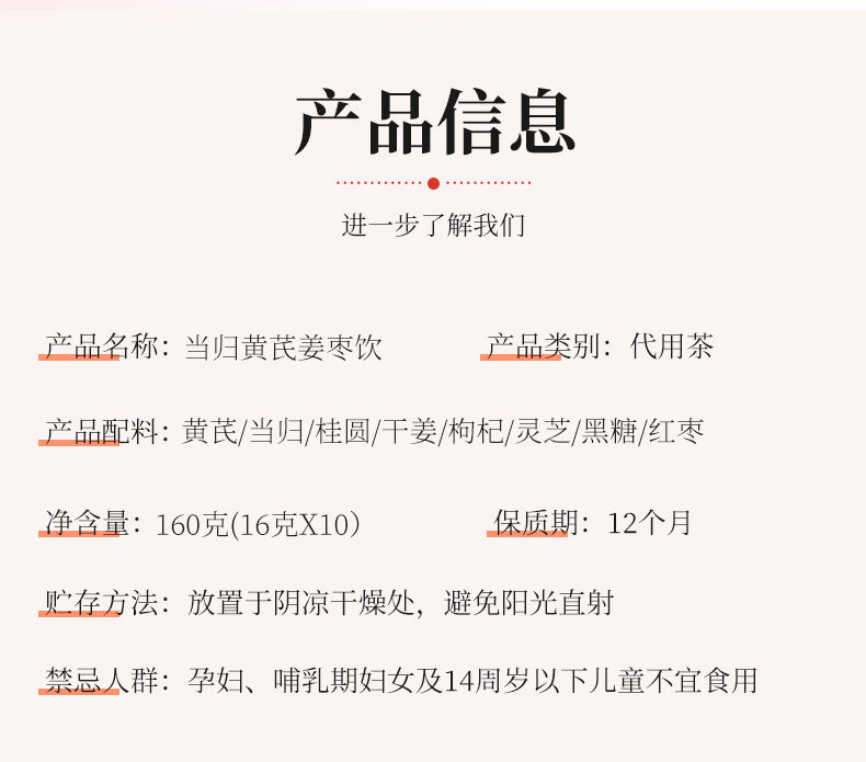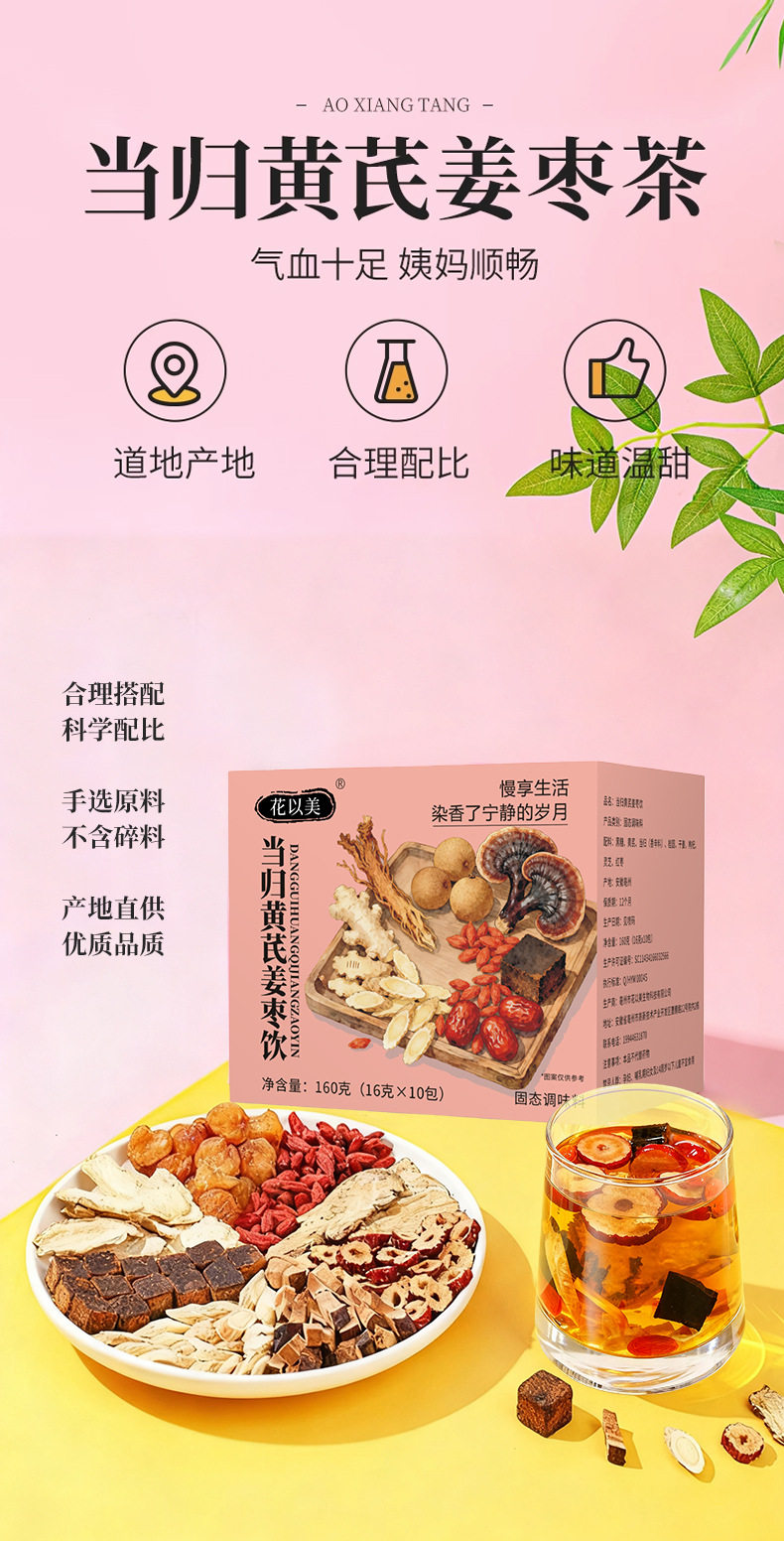 | Packaging specifications | Angelica, astragalus, ginger and date drink 160g |