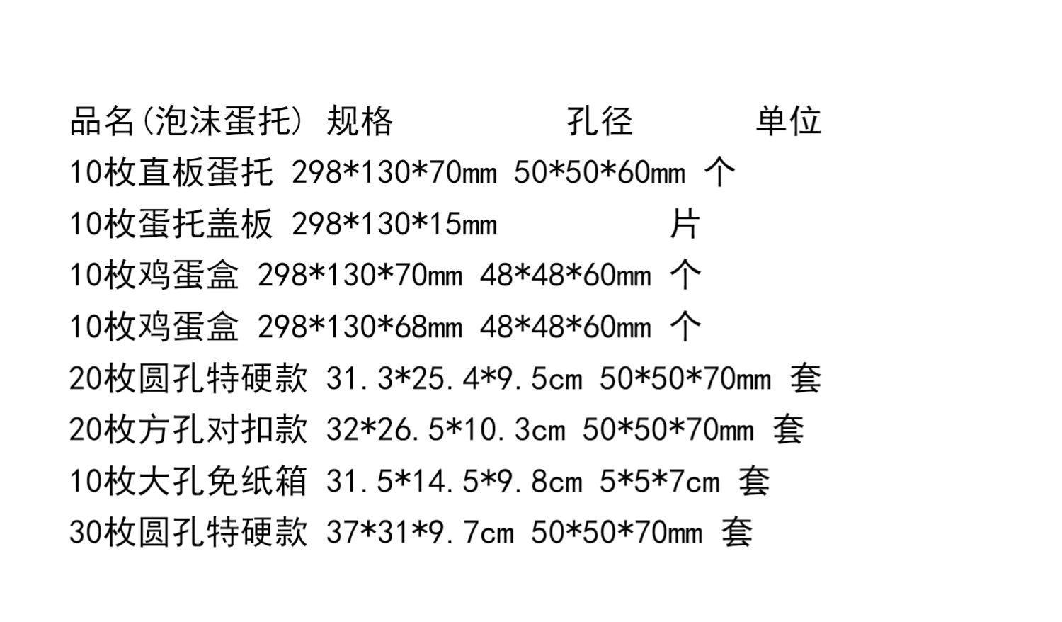 | Specifications and models | Universal egg tray for buckles and duck egg trays - 30 large holes, 7 sets of round holes, hardened,Universal egg tray for buckles and duck egg trays - 30 large holes, 8 sets of square hole covers,Universal egg tray for duck eggs - 20 round holes, 12 sets can hold 240 pieces, hardened,Universal egg tray for duck egg tray - 10 large holes and hardened 22 sets,Universal egg tray for duck eggs - large hole and round hole, 30 pieces, 4 sets,Universal egg tray for duck eggs - 6 sets of 20 round holes can hold 120 pieces,Universal egg tray for duck eggs - 5 sets of 10 large hole duck eggs and salted eggs,Universal egg tray for duck egg tray - 10/20/30 each set with round holes,Universal egg tray for duck egg tray - 2 sets of 30 large hole round holes for trial use,Universal egg tray for duck eggs - 20 square holes, 3 sets with lids,Universal egg tray for buckled duck egg tray - 10 pieces of carton-free preserved eggs and hardened 6 sets of small holes,Universal button egg tray and duck egg tray - 10 pieces with large holes, 22 sets,Universal buckle egg tray and duck egg tray - 10 buckles, 45*60 aperture, 32 sets of small holes |