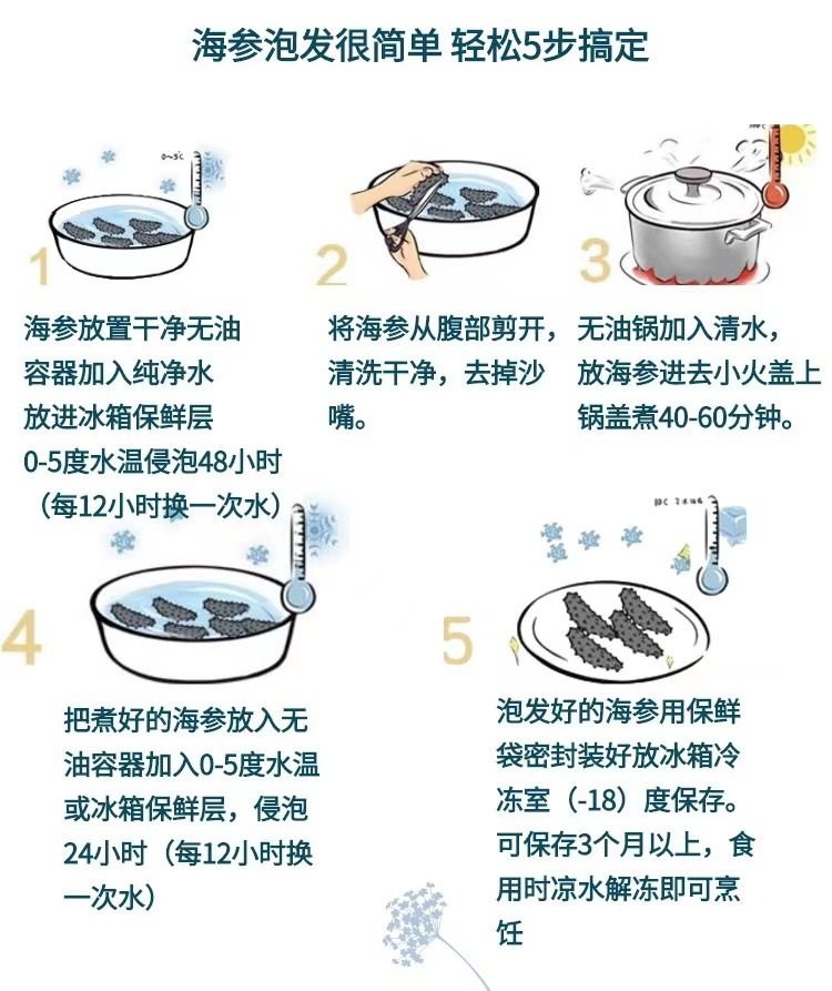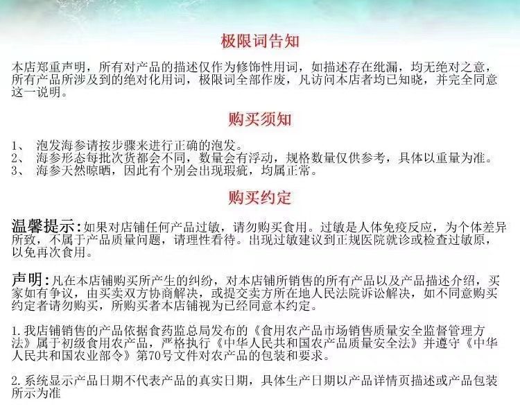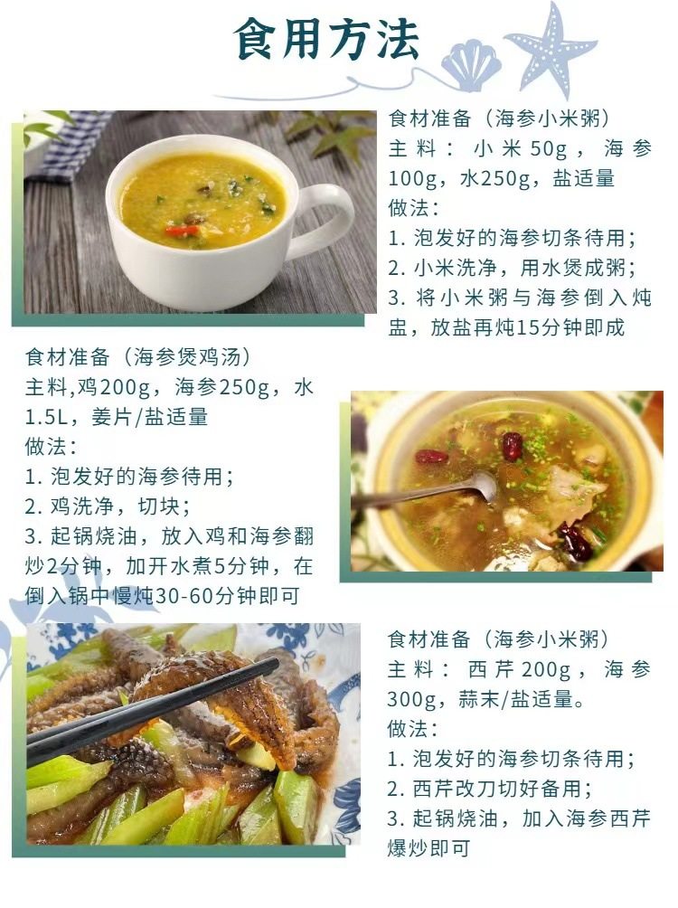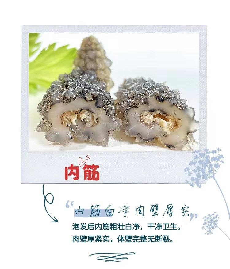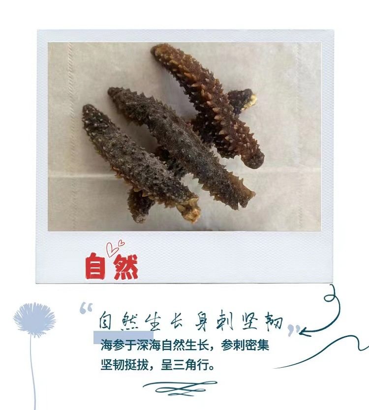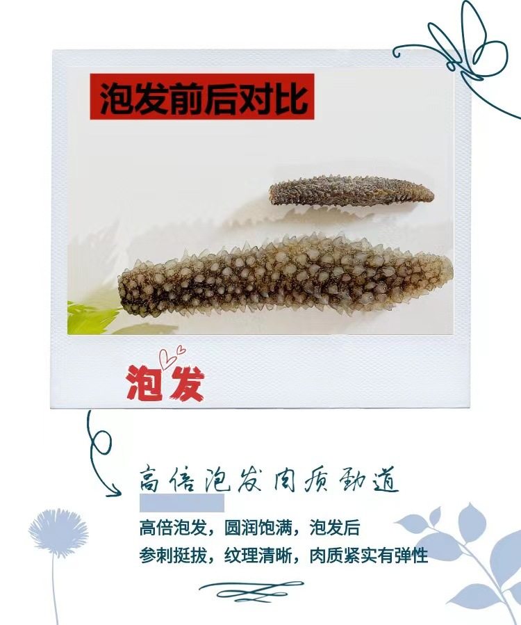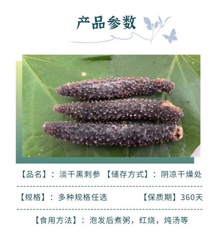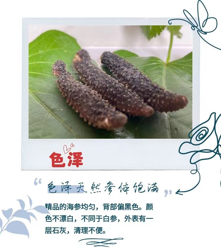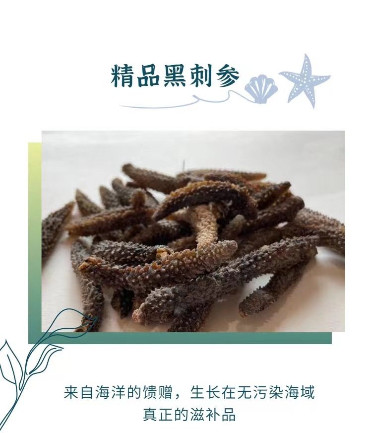 | Packaging specifications | Half a pound of medium-sized sea cucumber (about 75 heads),Medium sea cucumber 0.5kg (about 150 heads),Half a pound of large sea cucumber (about 50 heads),Large sea cucumber 0.5kg (about 100 heads) |