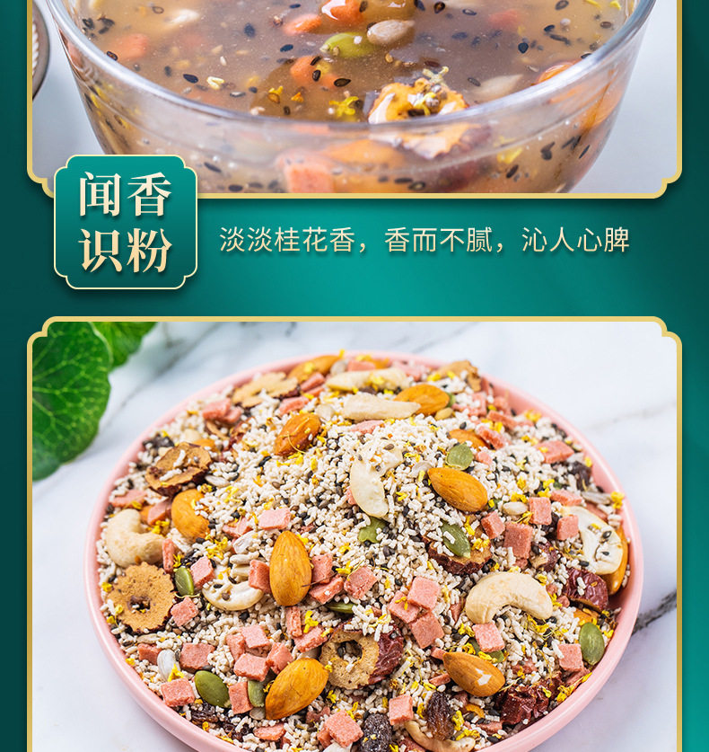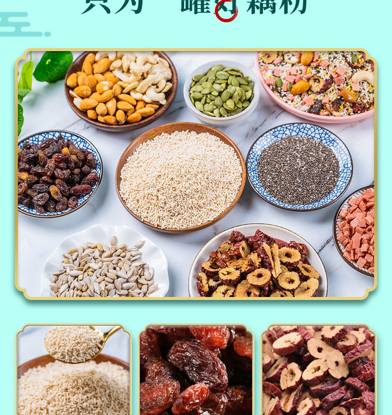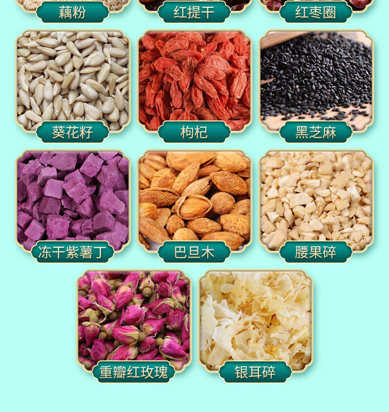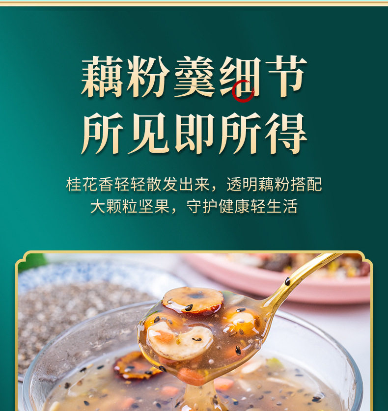 | Raw materials and ingredients | Red dates, nuts, white fungus, lotus root starch |