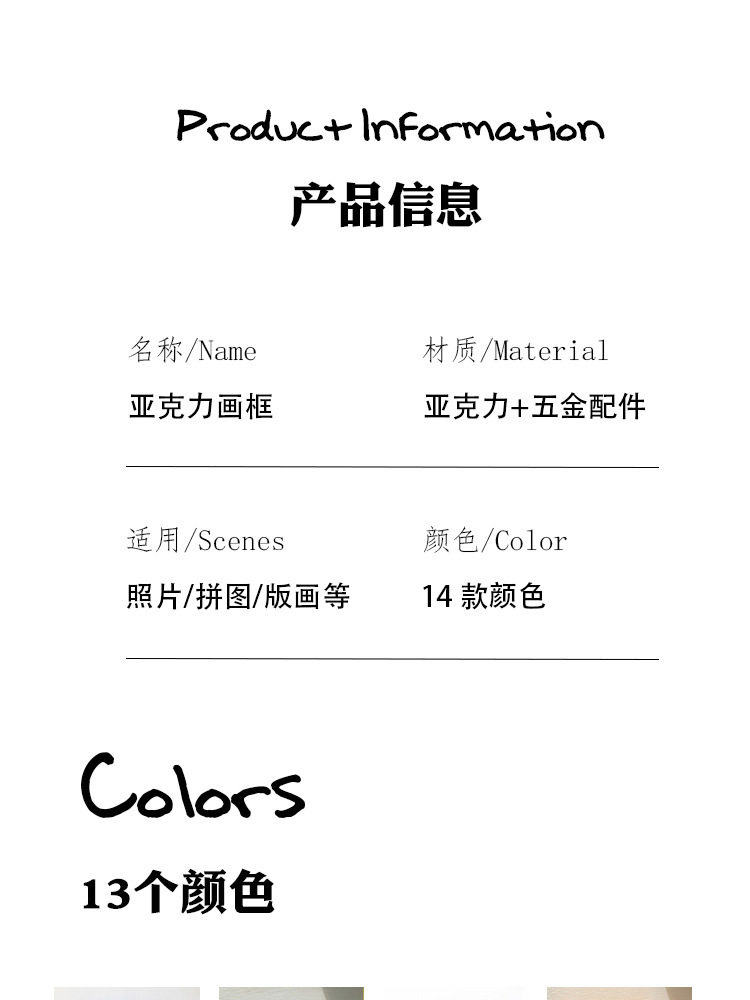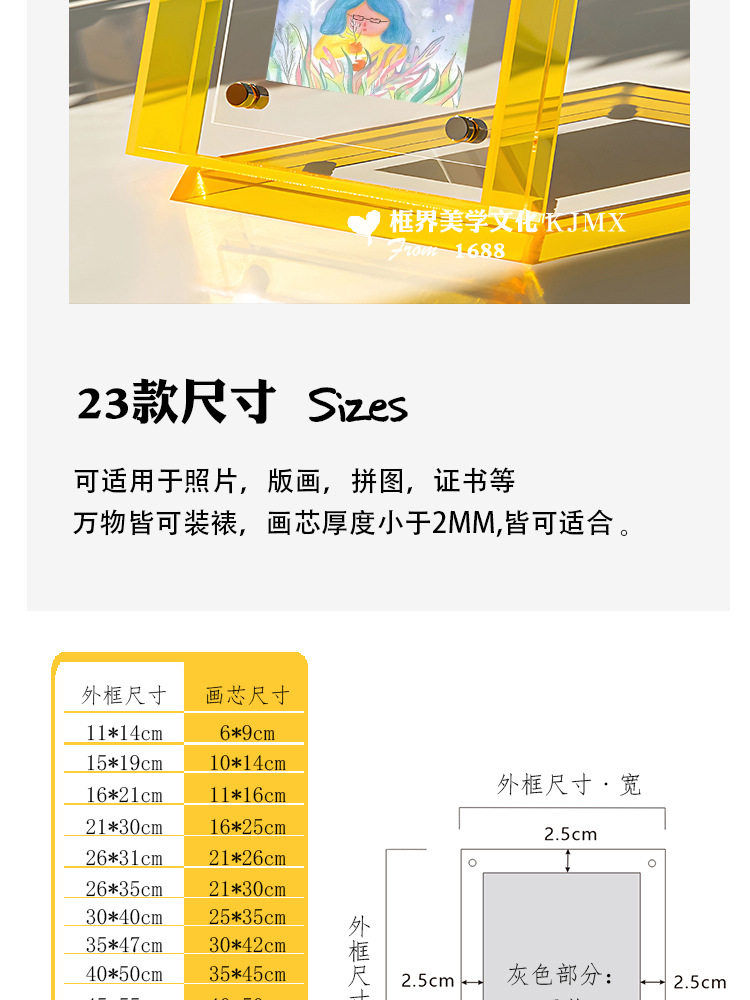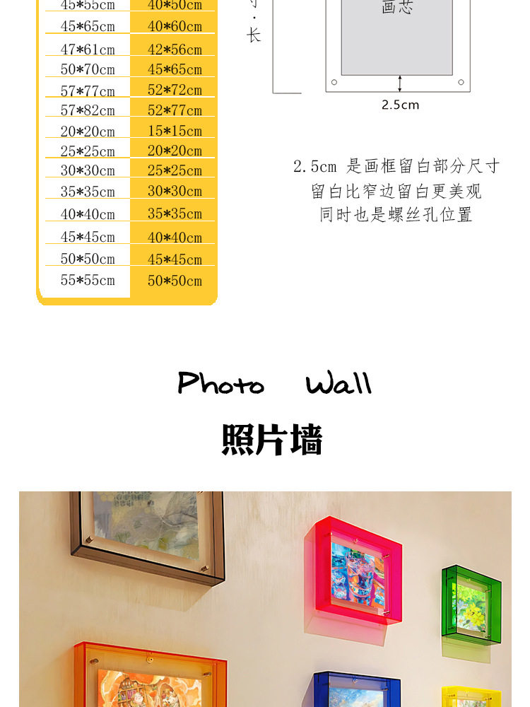 | Frame size | 11*14 [can hold 6*9] transparent screws/no hooks,15*19 [can hold 10*14] transparent screws/no hooks,16*21 [can hold 11*16] transparent screws/no hooks,21*26 [can hold 16*21cm] 8inch,21*30 [suitable for 16*25cm] a5/ 8inch,26*31【suitable for 21*26cm】 10inch,26*35 [suitable for 21*30cm] a4/ 12inch,30*40 [suitable for 25*35cm] b4,35*47 [suitable for 30*42cm] a3/8k,40*50 [suitable for 35*45cm] 16inch,45*55 [suitable for 40*50cm],47*61 [suitable for 42*56cm],45*65 [suitable for 40*60cm] 4k positive degree,50*70 [suitable for 45*65cm] a2/4k,57*77 [suitable for 52*72cm],57*82 [suitable for 52*77cm],20*20 [suitable for 15*15cm],25*25 [suitable for 20*20cm],30*30 [suitable for 25*25cm],35*35 [suitable for 30*30cm],40*40 [suitable for 35*35cm],45*45 [suitable for 40*40cm],50*50 [suitable for 45*45cm],55*55 [suitable for 50*50cm] |