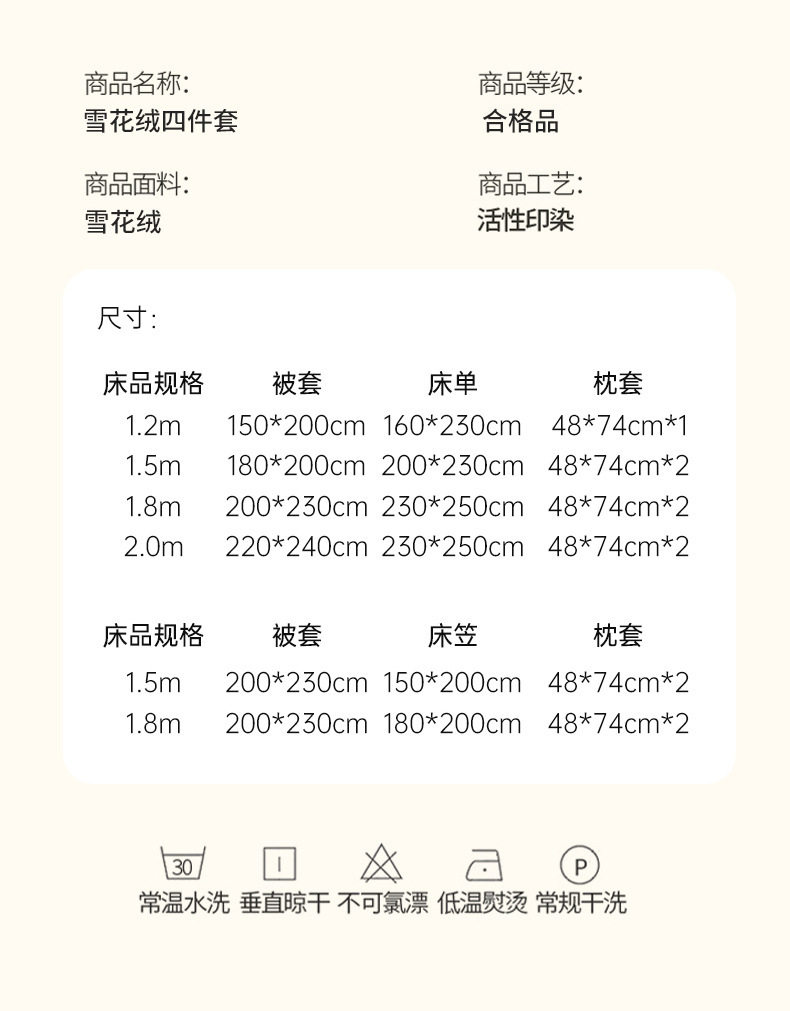 | Size specifications | 1.2 beds [quilt cover 150*200cm+sheet 160*230cm+one pillowcase],1.5 bed four-piece set [quilt cover 180*200cm+sheet 200*230cm+pair of pillowcases] 2,1.8 bed four-piece set [quilt cover 200*230cm+sheets 230*250cm+pair of pillowcases],2.0 bed four-piece set [quilt cover 220*240cm+sheets 230*250cm+pair of pillowcases],1.5-piece fitted sheet set [quilt cover 200*230cm+ fitted sheet 150*200cm+ pair of pillowcases],1.8-piece fitted sheet set [quilt cover 200*230cm+ fitted sheet 180*200cm+ pair of pillowcases],One 48*74cm pillowcase,150*200cm [single quilt cover],180*200cm [single quilt cover],200*230cm [single quilt cover],220*240cm [single quilt cover] |