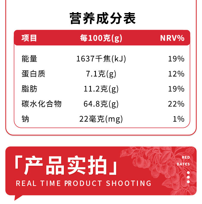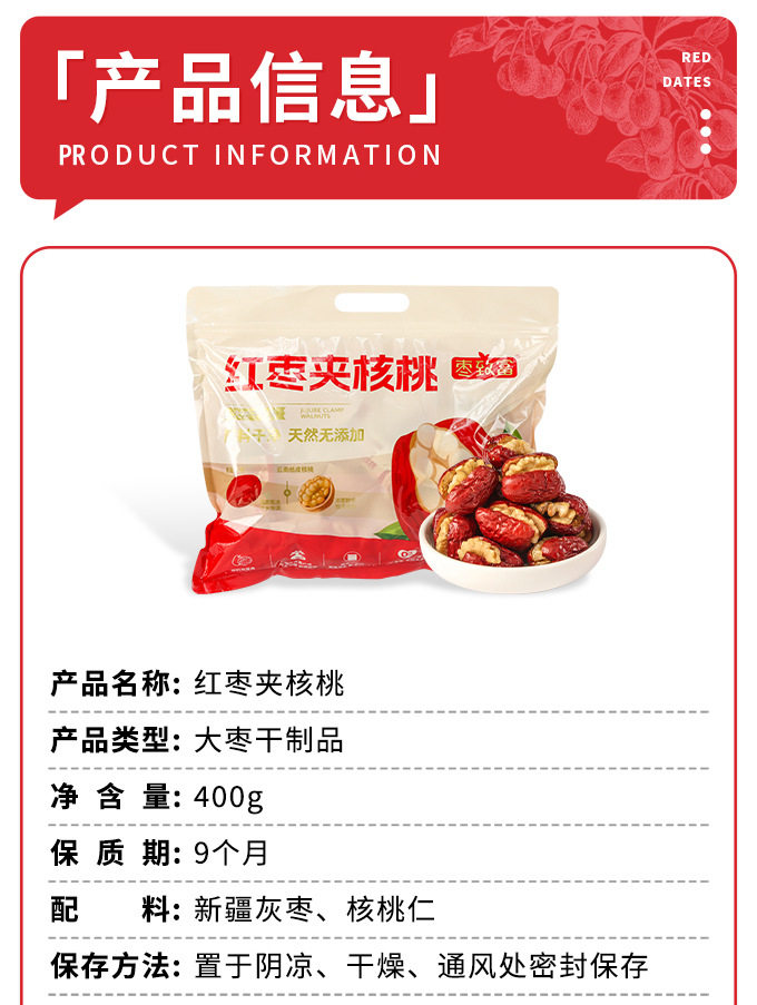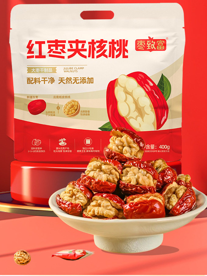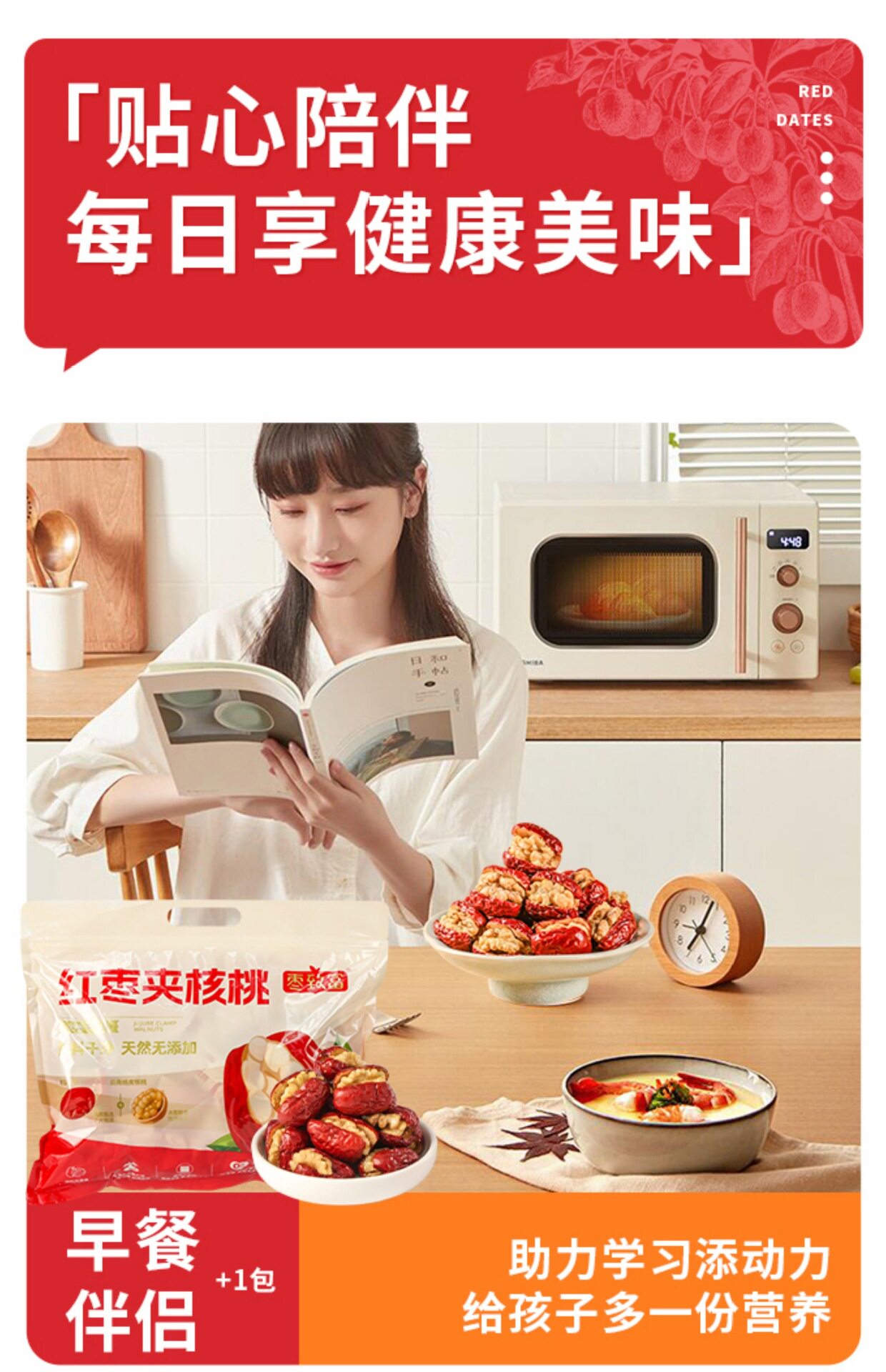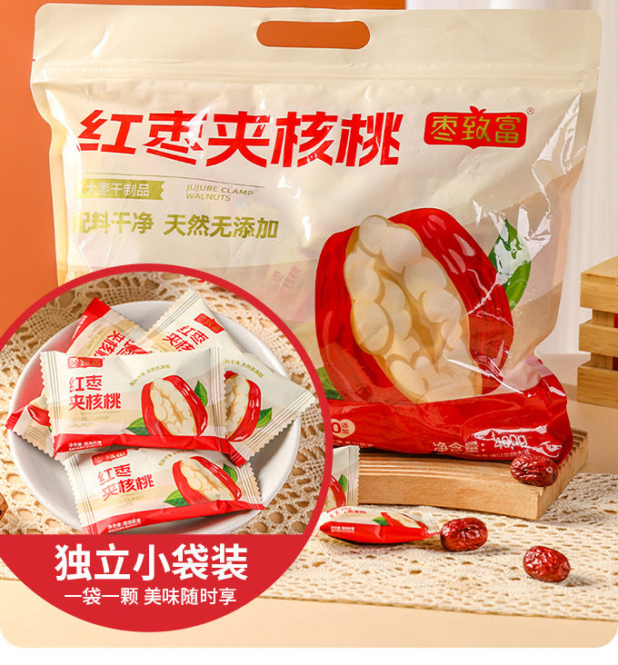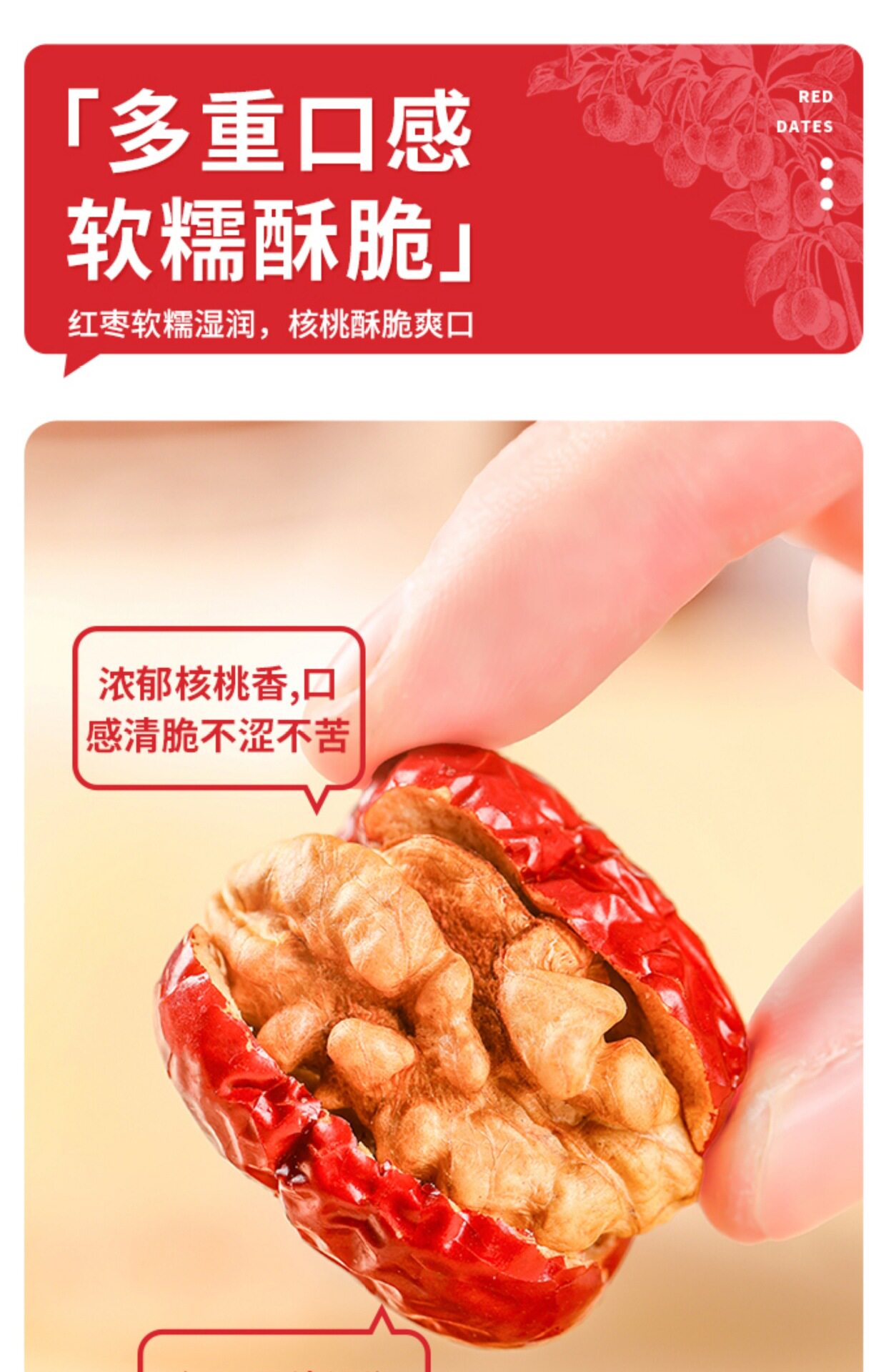 | Specifications | Ingredients are only: xinjiang red dates, walnut kernels,Single capsules in small packages, ready to eat after opening, clean and convenient,Dates and walnuts 400g*2 bags [first choice for repeat customers],Dates and walnuts 400g*1 bag [new customers try new experience],Dates and walnuts 800g×1 box [healthy and more nutritious],Dates and walnuts 800g × 2 boxes [two boxes come with exquisite handbags for more gift-giving],800g dates and walnuts + 900g daily red dates (free handbag),800g dates and walnuts + 900g daily red dates [free handbag],Dates and walnuts 400g* bag [new customers try new experience] |