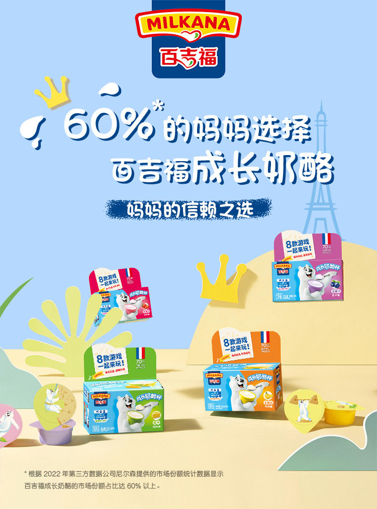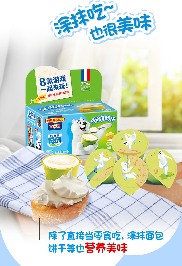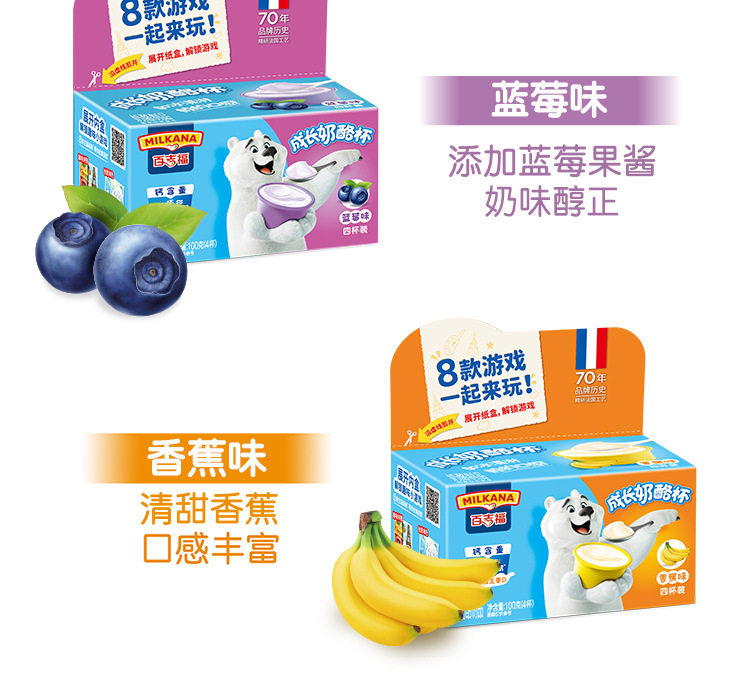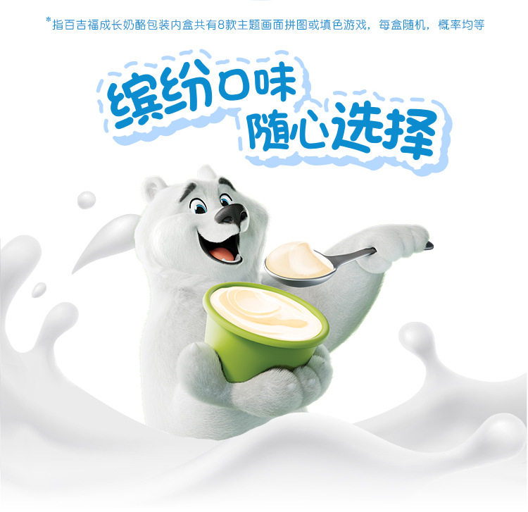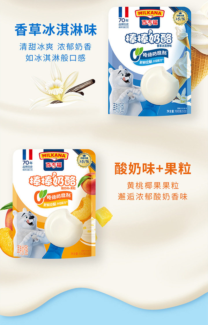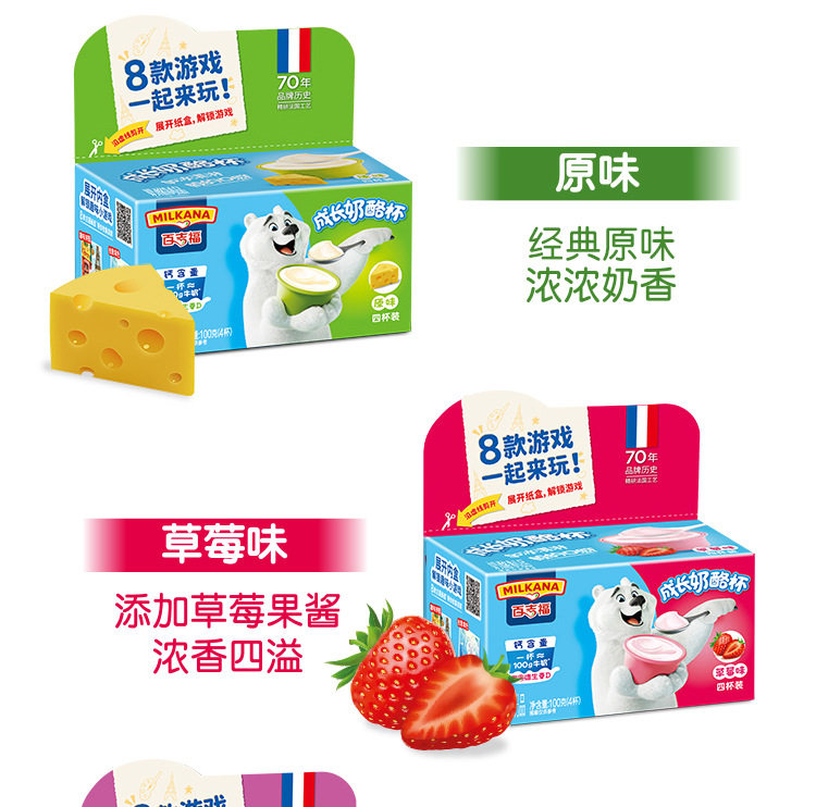| Packaging specifications | 【5 pieces】original cheese sticks 100g,【5 pieces】mixed fruit flavored cheese sticks 100g,【5 pieces】vanilla ice cream flavored cheese sticks 100g,【5 pieces】colorful berry flavored cheese sticks 100g,【5 pieces】yogurt fruit flavored cheese sticks 100g,【5 pieces】strawberry flavored cheese sticks 100g,【5 pieces】orange flavored fruit cheese sticks 100g,【5 pieces】grape flavored cheese sticks 100g,【4 cups】original growing cheese 100g,【4 cups】banana flavored growing cheese 100g,【4 cups】blueberry flavored growing cheese 100g,【4 cups】strawberry flavored growing cheese 100g |