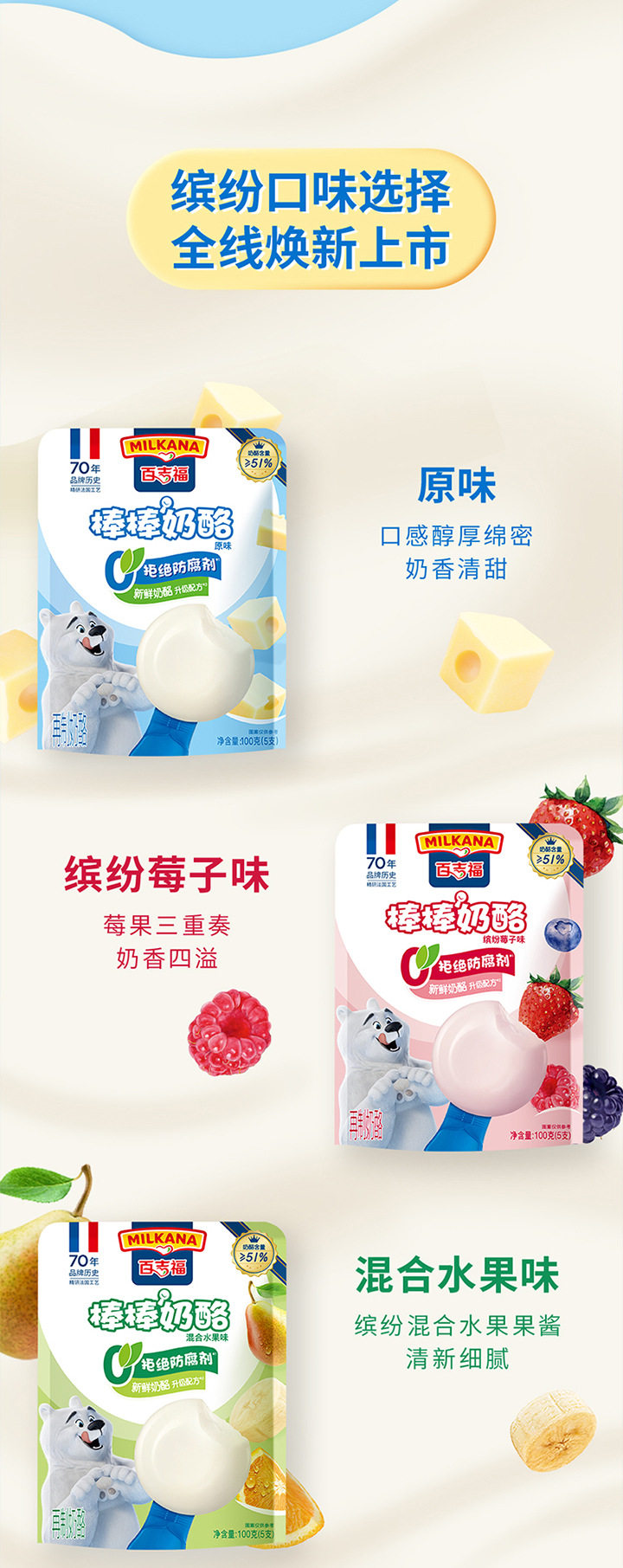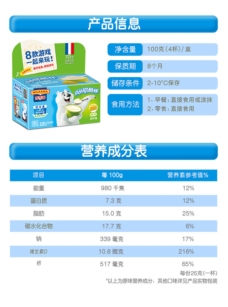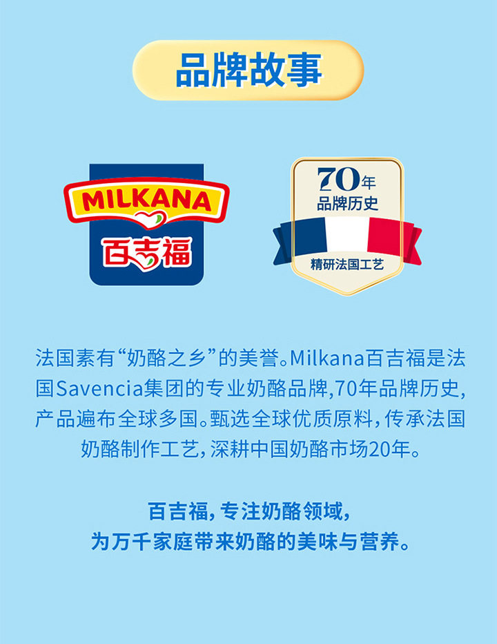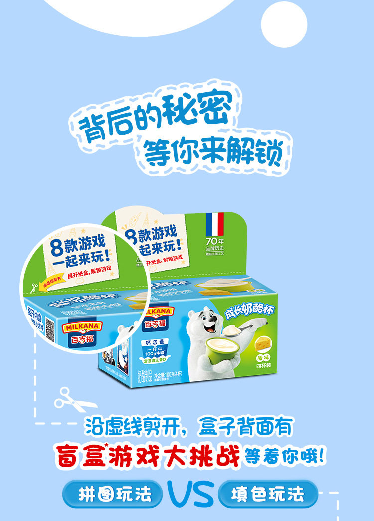 | Packaging specifications | 【5 pieces】original cheese sticks 100g,【5 pieces】mixed fruit flavored cheese sticks 100g,【5 pieces】vanilla ice cream flavored cheese sticks 100g,【5 pieces】colorful berry flavored cheese sticks 100g,【5 pieces】yogurt fruit flavored cheese sticks 100g,【5 pieces】strawberry flavored cheese sticks 100g,【5 pieces】orange flavored fruit cheese sticks 100g,【5 pieces】grape flavored cheese sticks 100g,【4 cups】original growing cheese 100g,【4 cups】banana flavored growing cheese 100g,【4 cups】blueberry flavored growing cheese 100g,【4 cups】strawberry flavored growing cheese 100g |