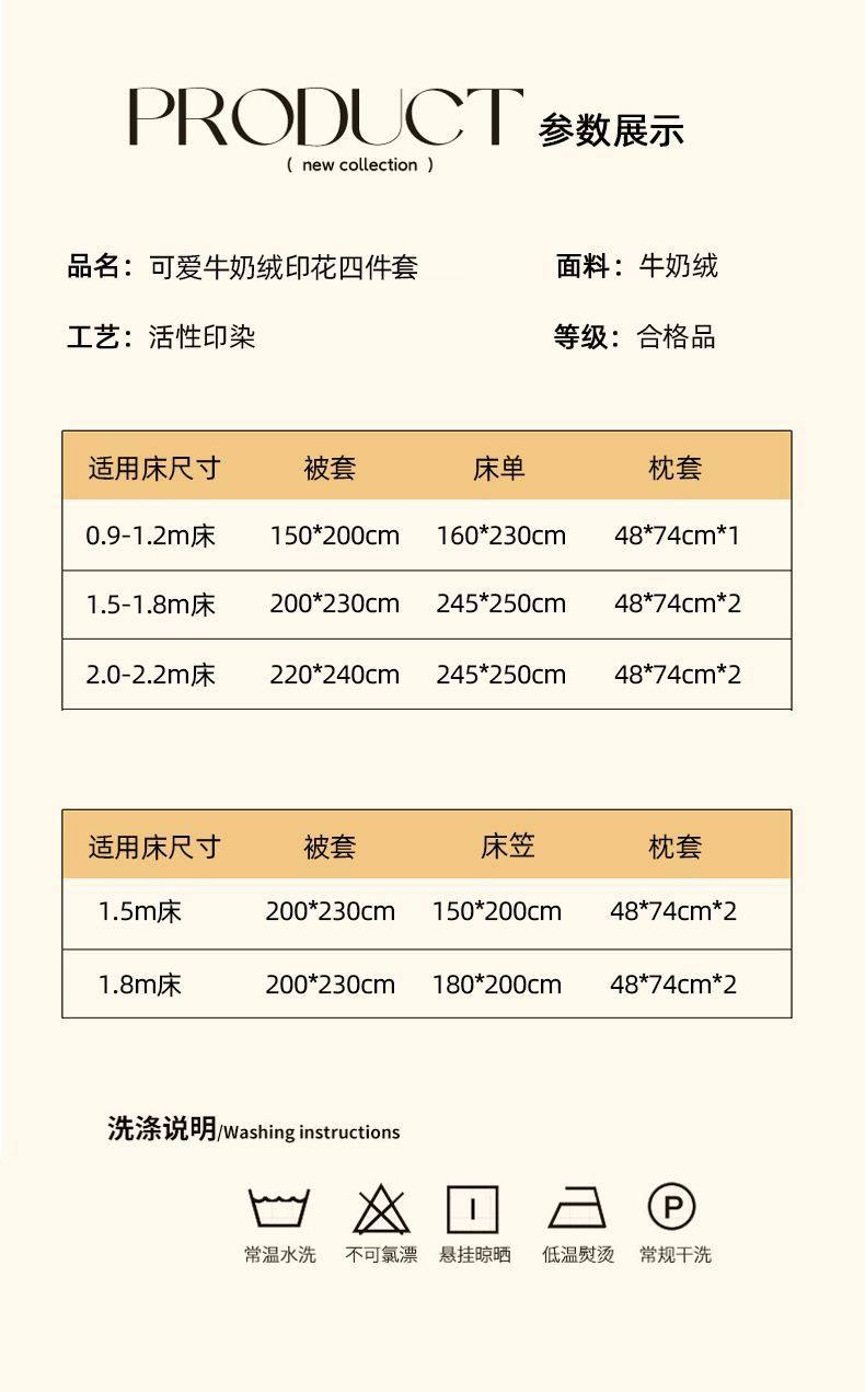 | Size specifications | 0.9m-1.2m bed sheet three-piece set,1.5m bed sheet four-piece set,1.8m bed sheet four-piece set,2.0m bed sheet four-piece set,1.5m fitted sheet set of four,1.8m fitted sheet set of four |