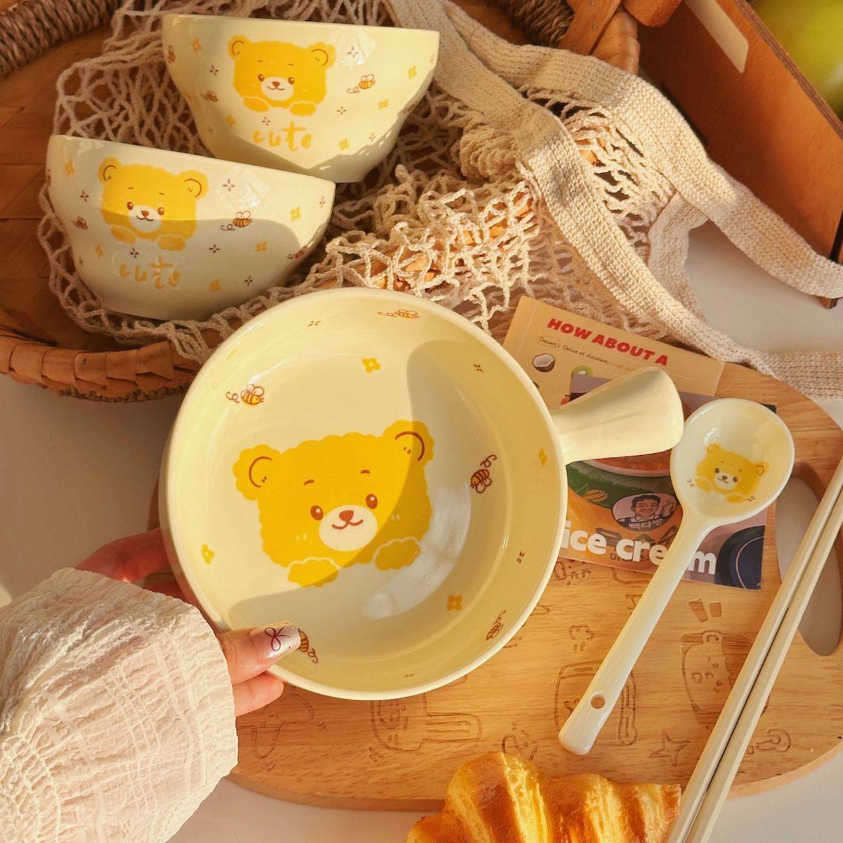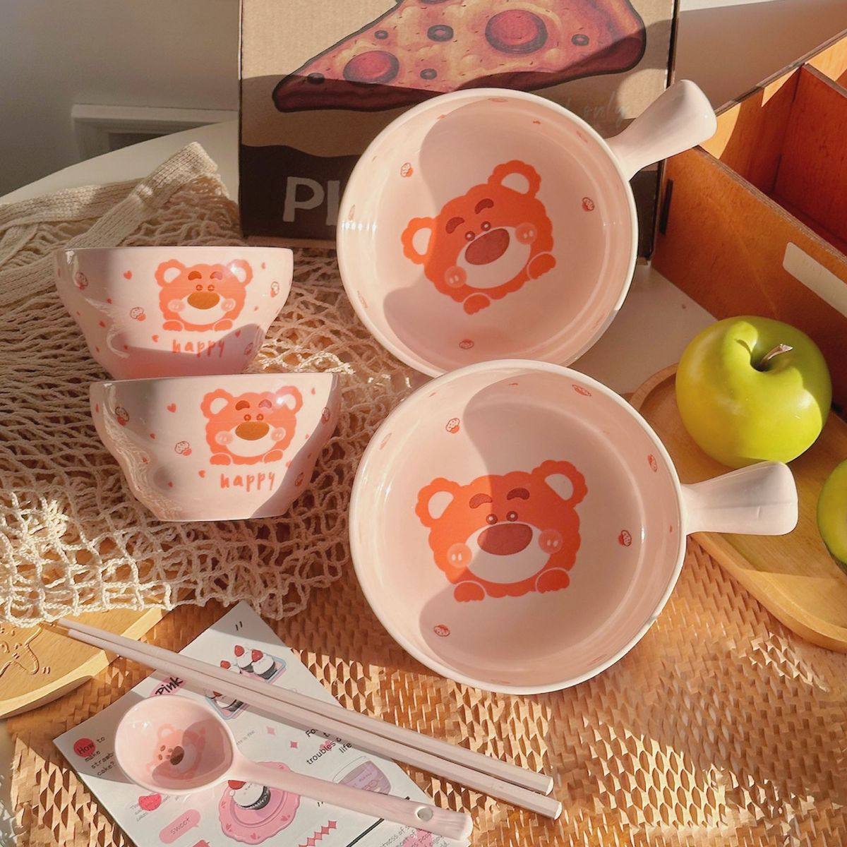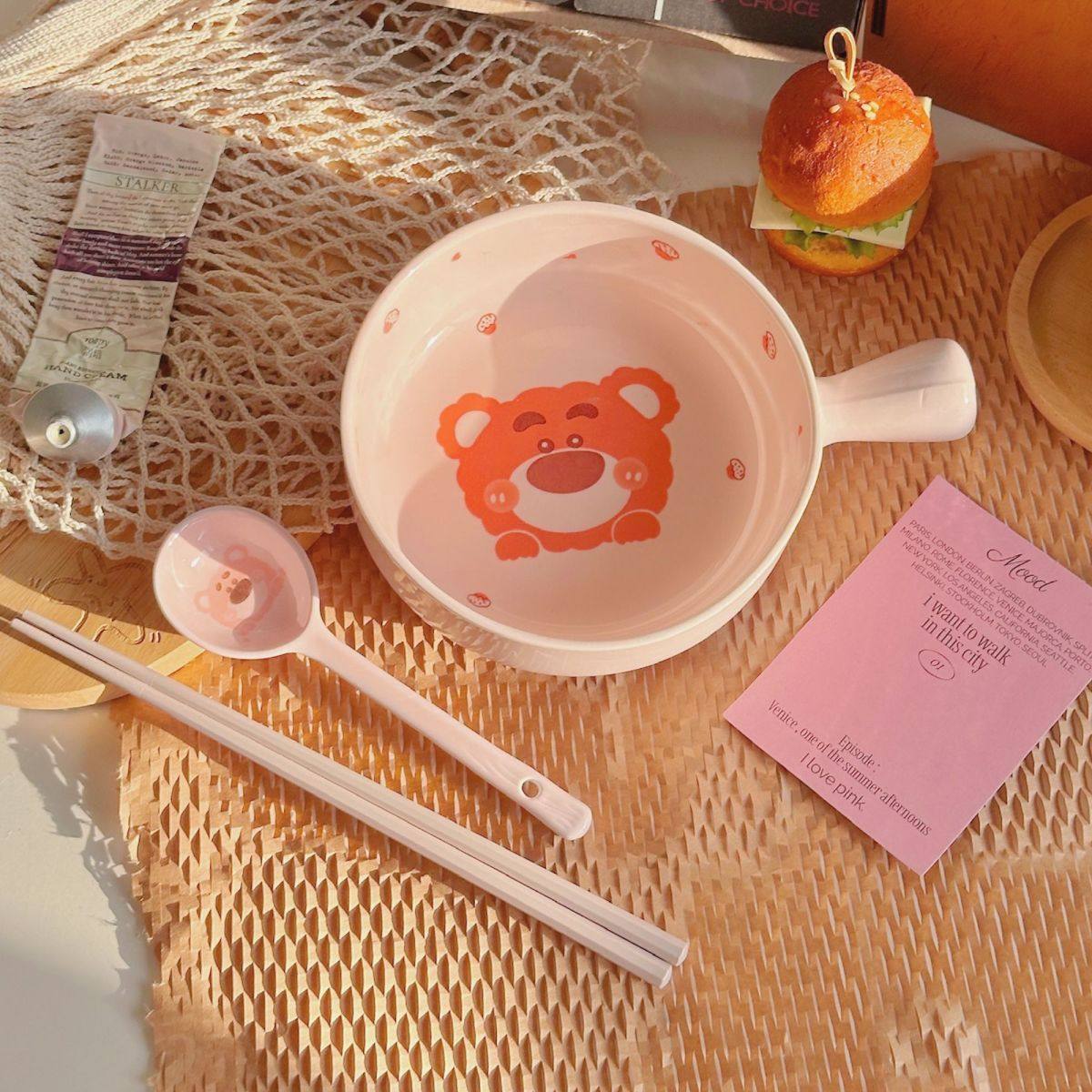 Strawberry Bear Ceramic Handle Bowl Household Cute Rice Bowl Oven Special Baking Bowl Student Dormitory Single Handle Instant Noodle Bowl