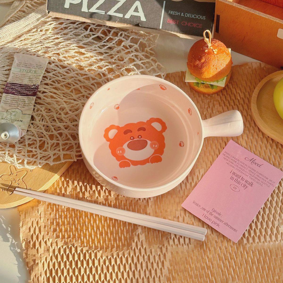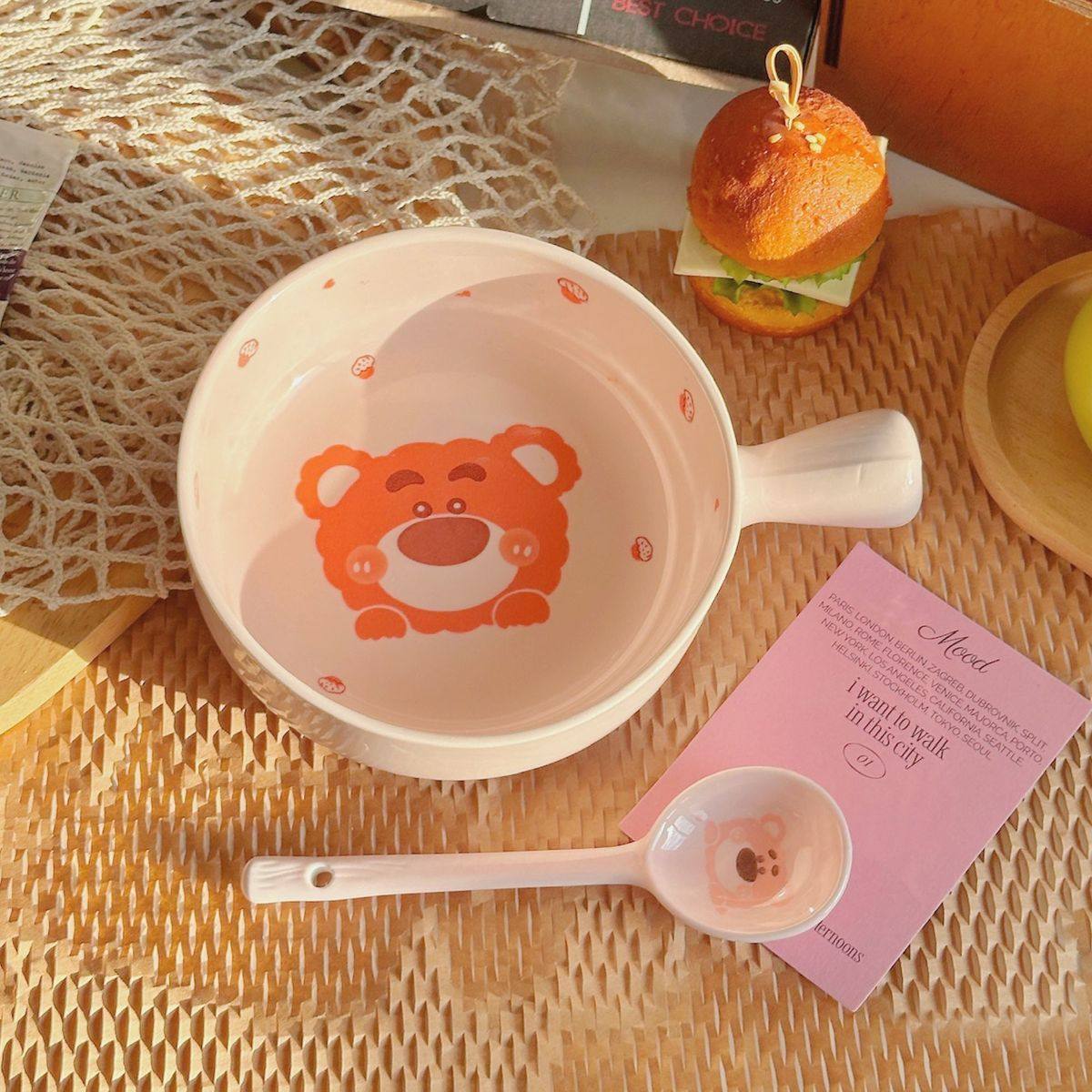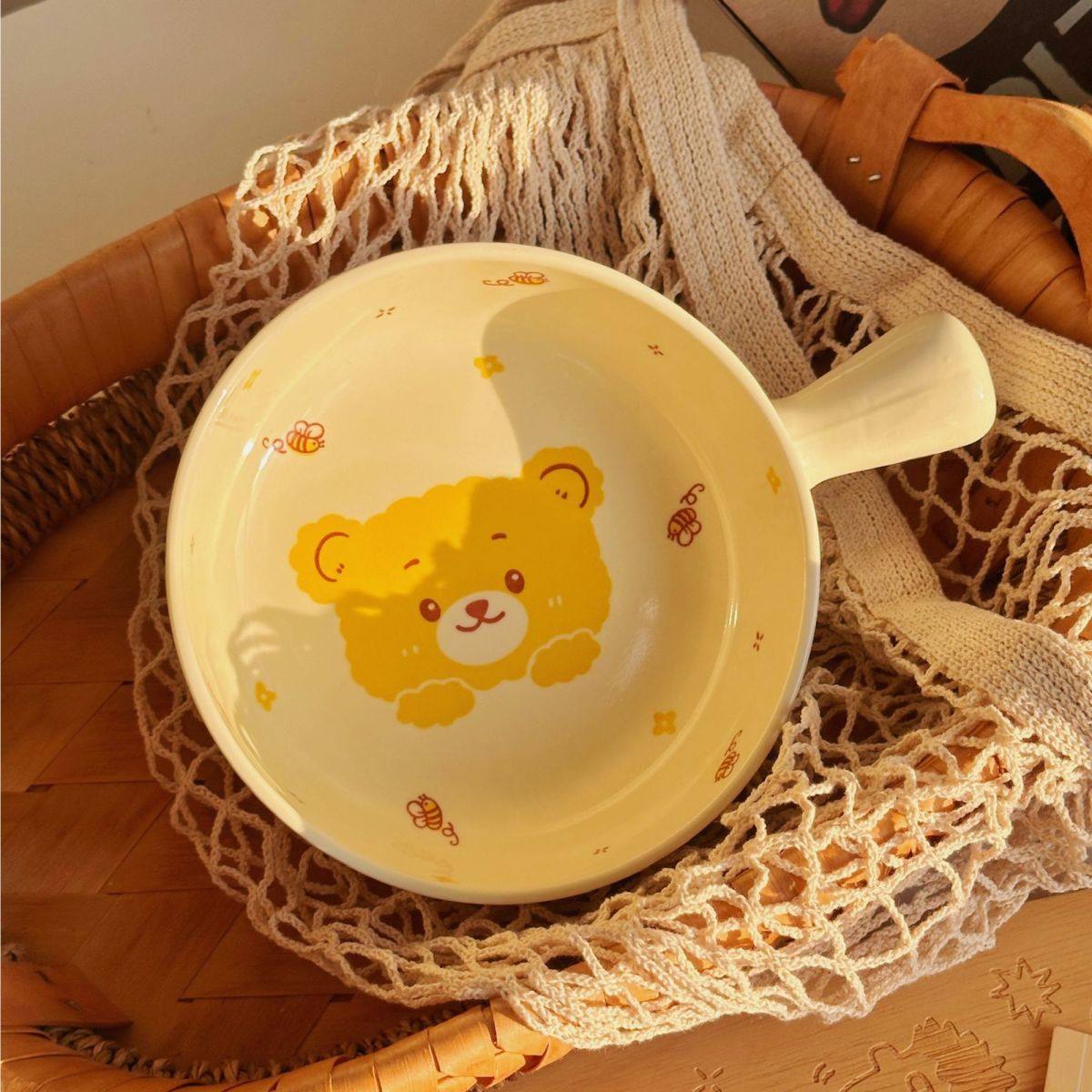 Strawberry Bear Ceramic Handle Bowl Household Cute Rice Bowl Oven Special Baking Bowl Student Dormitory Single Handle Instant Noodle Bowl