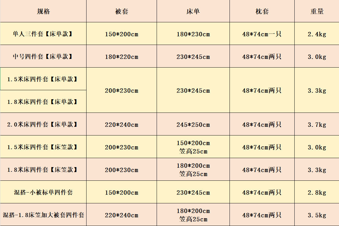 | Size specifications | Single bed sheet three-piece set [quilt cover 150*200],Medium size - four-piece bed sheet set [quilt cover 180*220],1.5 bed sheet four-piece set [quilt cover 200*230],1.8 bed sheet four-piece set [quilt cover 200*230],2.0 bed sheet four-piece set [quilt cover 220*240],1.5 fitted sheet set of four [quilt cover 200*230],1.8 fitted sheet set of four [quilt cover 200*230],150*200cm [single quilt cover],180*220cm [single quilt cover],200*230cm [single quilt cover],220*240cm [single quilt cover],1 pair of pillowcases |