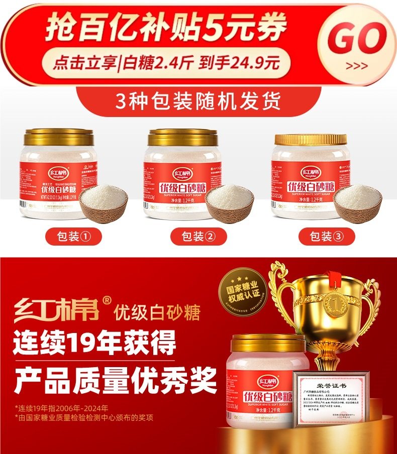 | Packaging specifications | [fine sugar] premium white sugar 1200g,[combined more savings] 1200g soft white sugar + 1200g white sugar |