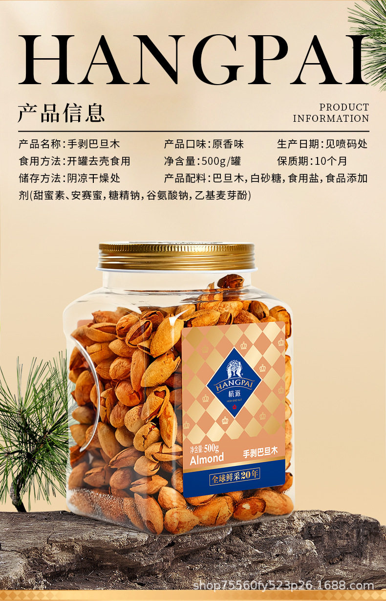 | Packaging specifications | Hand peeled almonds 500g |